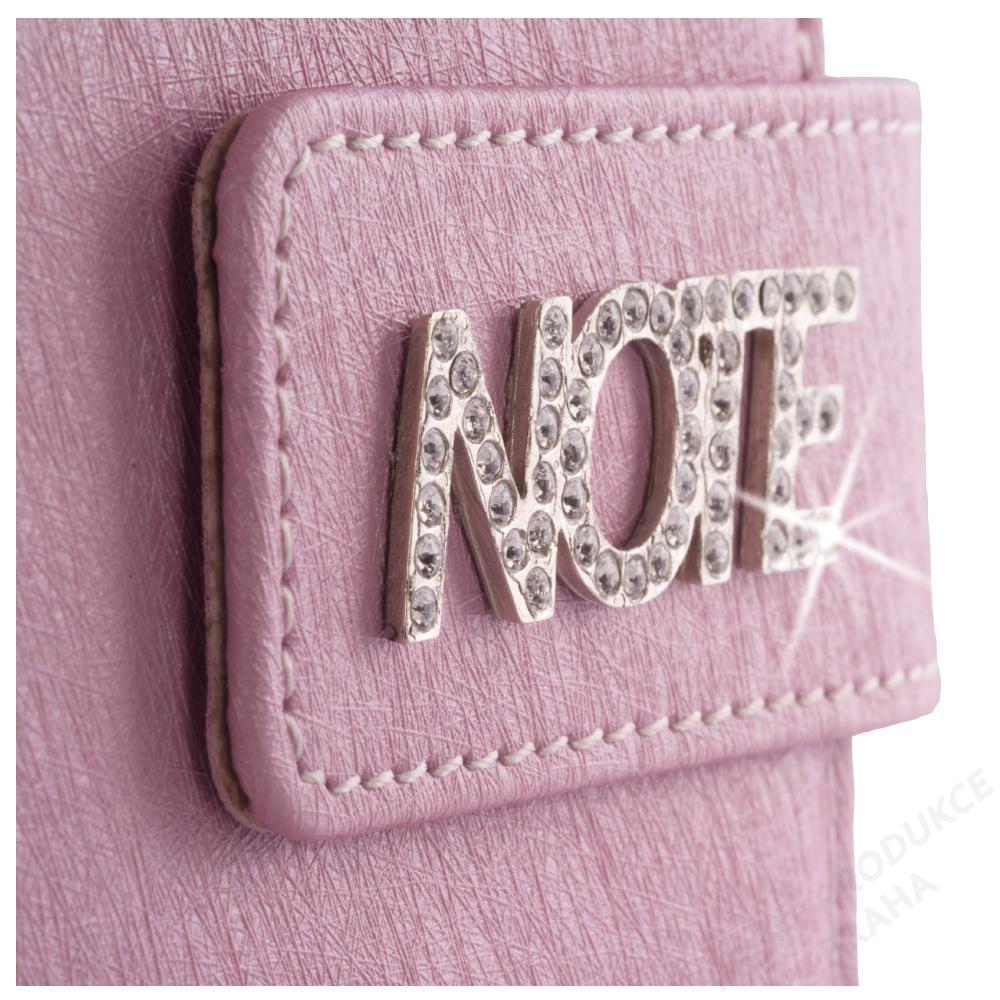 Formát: B6 - Rozměr: 120 x 165 mm - Potahový materiál: koženka - Vazba: šitá V8 (tkaná niť) - Barva bloku: bílá - Papír: nelinkovaný s perforací - Záložka: bílá - Počet stran: 144 - - Šperk Note je vyroben z niklu a v něm jsou vsazeny krystalky. - Součástí je tenké kovové pero a magnetické zavírání. - Notes je balen v dárkové krabičce vystlané saténem.