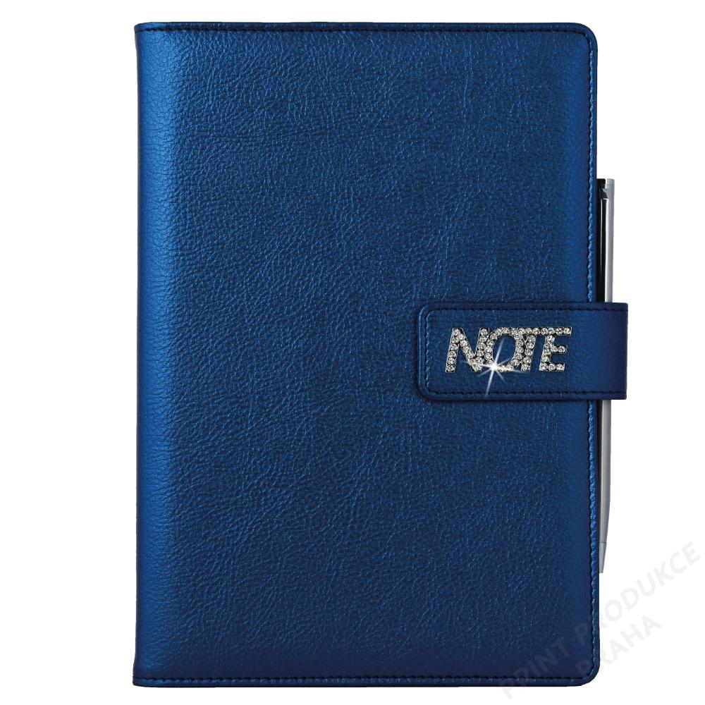 Formát: A5 - Rozměr: 143 x 205 mm - Potahový materiál: koženka - Vazba: šitá V8 (tkaná niť) - Barva bloku: bílá - Papír: nelinkovaný s perforací - Záložka: bílá - Počet stran: 144 - - Šperk Note je vyroben z niklu a v něm jsou vsazeny krystalky. - Součástí je tenké kovové pero a magnetické zavírání. - Notes je balen v dárkové krabičce vystlané saténem.