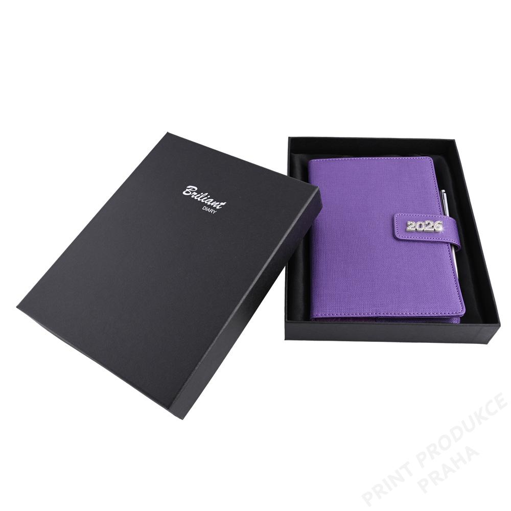 Rozsah: 142 stran - Vazba: šitá V8 (tkaná nit) - Kalendárium: týdenní české jmenné - Jazykové mutace: CZ, SK, EN, DE, RU - Barva bloku: bílá - Barva písma: modrá a červená - Diář obsahuje: kulaté odtrhávací rožky, bílou záložku, - kovovou propisku a magnetické zavírání - Potahový materiál: koženka - - Obsah kalendária: znamení zvěrokruhu, přehledný kalendář, - plánovací kalendář 2026, roční plánovací kalendář CZ a SK, - přehled přiznání a plateb daní CZ a SK, poznámky, - mezinárodní tel. spojení, CZ křestní jména, časová pásma, - státní a církevní svátky ve světě, vzdálenosti v km EU/CZ/SK, - plánovací kalendář 2027, mapy - ČR, SK, Praha, Bratislava. - - Šperk letopočtu je vyroben z niklu a v něm jsou vsazeny krystalky. - Diář je balen v dárkové krabičce vystlané saténem.