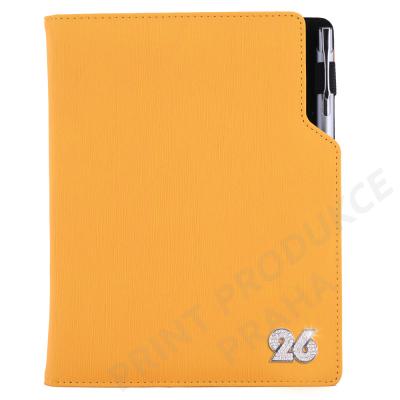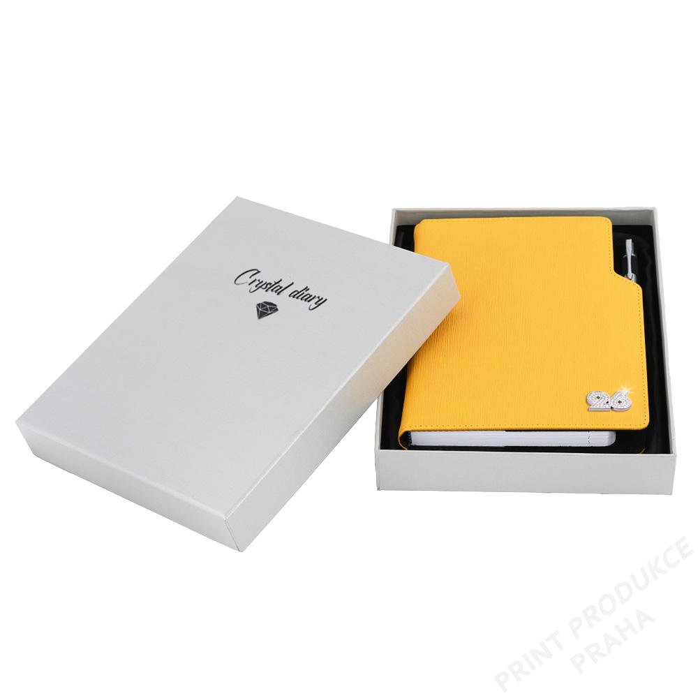 Blok vkládaný do desek diáře - Rozsah: 142 stran - Vazba: šitá V8 (tkaná nit) - Kalendárium: týdenní slovenské jmenné - Jazykové mutace: SK, CZ, EN, DE, RU - Barva bloku: bílá - Barva písma: modrá a červená - Diář obsahuje: kulaté odtrhávací rožky, bílou záložku a propisku - Materiál vnější: pěnová výplň desky potažená matnou strukturovanou koženkou - Materiál vnitřní: černý samet - - Obsah kalendária: znamení zvěrokruhu, přehledný kalendář, plánovací kalendář 2026, - roční plánovací kalendář SK a CZ, přehled přiznání a plateb daní SK a CZ, - mezinárodní tel. spojení, SK křestní jména, časová pásma, - státní a církevní svátky ve světě, vzdálenosti v km EU/SK/CZ, - plánovací kalendář 2027, poznámky, mapy - SK, ČR, Praha, Bratislava. - - Součástí je křišťálový letopočet, který je vyroben z niklu a v něm jsou vsazeny krystalky. - Diář je balen v dárkové krabičce vystalné saténem. - - Diář je vhodný pro sleporažbu a barevnou ražbu.