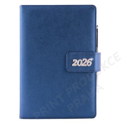 Rozsah: 140 stran - Vazba: šitá V8 (tkaná nit) - Kalendárium: týdenní jmenné CZ/SK na jedné straně + strana na poznámky - Jazyky: CZ, SK, EN, DE, RU - Barva bloku: bílá - Barva písma: modrá a červená - Diář obsahuje: kulaté odtrhávací rožky,bílou záložku, - kovovou propisku a magnetické zavírání - Potahový materiál: koženka - - Obsah kalendária: znamení zvěrokruhu, přehledný kalendář, - plánovací kalendář 2026, roční plánovací kalendář CZ a SK, - přehled přiznání a plateb daní CZ a SK, časová pásma, - mezinárodní tel. spojení, CZ/SK křestní jména, poznámky, - státní a církevní svátky ve světě, vzdálenosti v km EU/CZ/SK, - plánovací kalendář 2027, mapy - ČR, SK, Praha, Bratislava. - - Šperk letopočtu je vyroben z niklu a v něm jsou vsazeny krystalky. - Diář je balen v dárkové krabičce vystlané saténem.