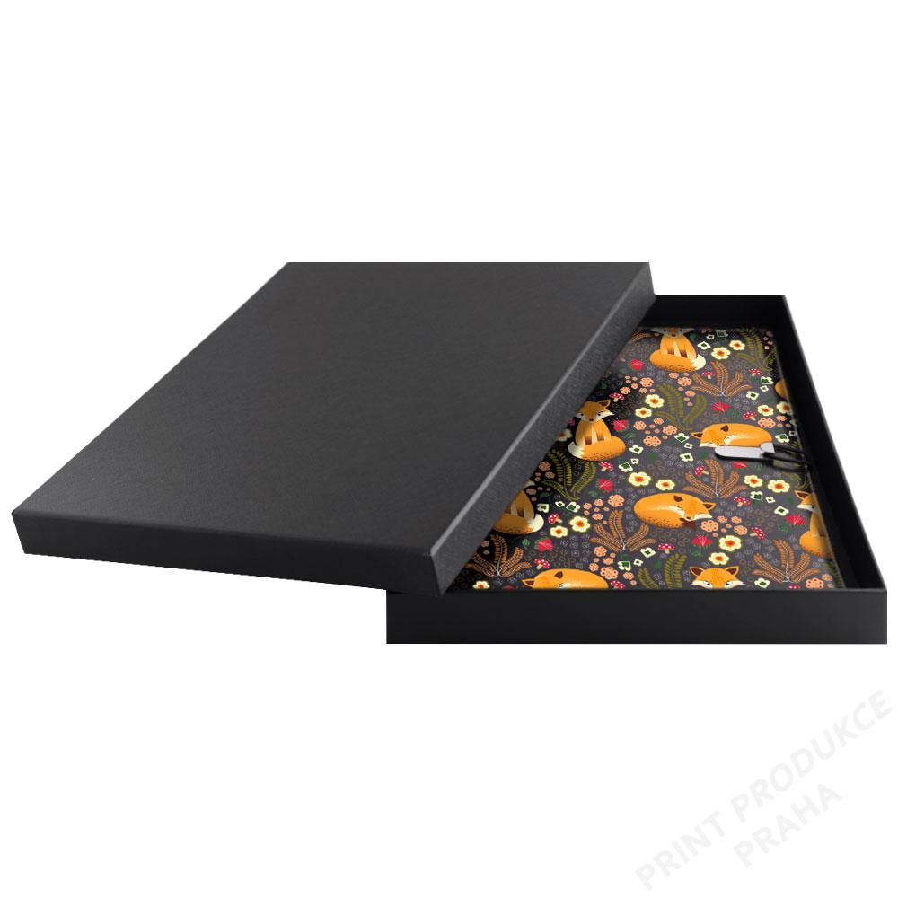 GEP konferenční desky v dárkové krabičce černé - Liška s tečkovaným blokem - Tyto desky jsou ideálním pomocníkem k pořizování poznámek. - Jsou vhodné také jako reprezentativní dárek zabalený v luxusní krabičce. - Do desek GEP je možno dokupovat další náhradní bloky. - Jsou vhodné k reklamní ražbě log, k potisku, ke gravírování atd… - Na desky umíme jako jediní na světě i plnobarevnou ražbu. - Jsou vybaveny estetickým zapínáním na gumičku s kovovým štítkem. - Bloky do desek je možno vyrobit na zakázku s grafikou klienta. (od 100 ks) - Propisku můžeme na přání potisknout. - Na zakázku můžeme desky vyrobit i z jiných potahových materiálů a barev. - - - Konferenční desky GEP standardně obsahují: - - Koženkové desky o rozměru 24,5 x 31,5 cm (vnější rozměr) - - tečkovaný A4 s 50 ti stranami - - zapínání na gumičku s kovovým štítkem - - vnitřní přihrádku na dokumenty - - 2 x přihrádku na karty, vizitky aj. - - 2 x poutko na propisku - - luxusní dárkovou krabičku vhodnou k potisku