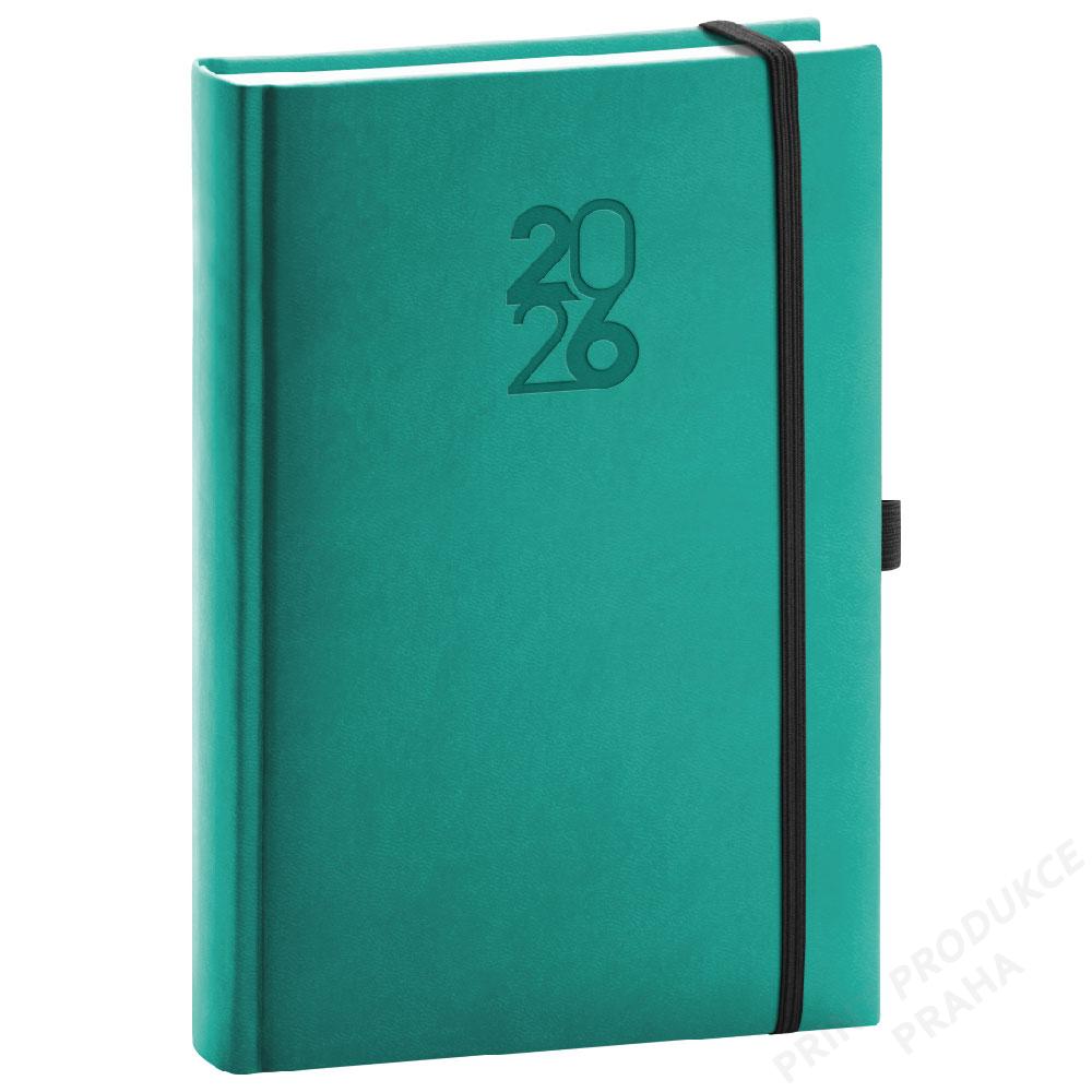Rozměr: 15 x 21 cm - Formát: A5 - Kalendárium: 6jazyčné denní (CZ, SK, EN, DE, HU, RU) - Počet stran: 352 stran - Potahový materiál: hladká matná koženka - Vazba: tuhá knižní - Barva bloku: bílá - - Diář obsahuje: místo pro osobní údaje, měsíční plánování 2026 a 2027, - roční plánování 2026 a 2027, pracovní plánovací kalendář, mapa ČR a SK, - svátky ČR/ SK + mezinárodní svátky, rozšířený seznam českých jmen. - - Součástí je ražba roku, gumička na zavření a poutko na pero. - Vhodný pro ražbu, ražbu přes folii, barevnou ražbu a potisk.