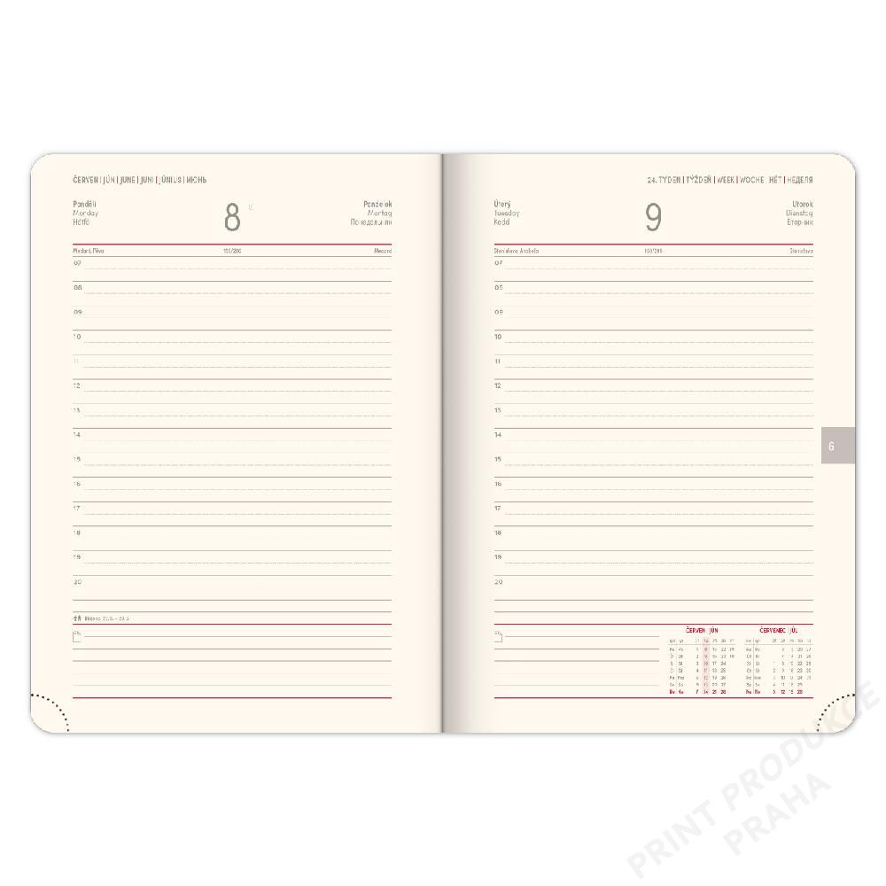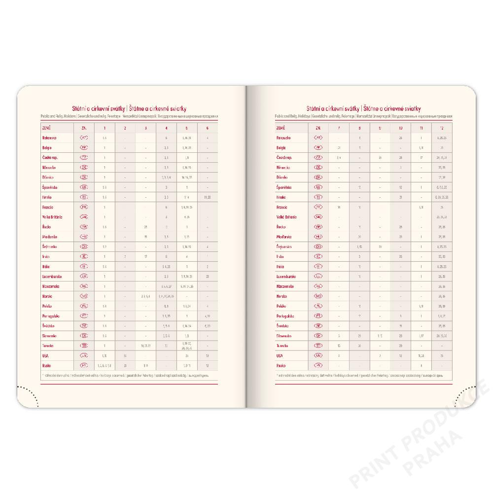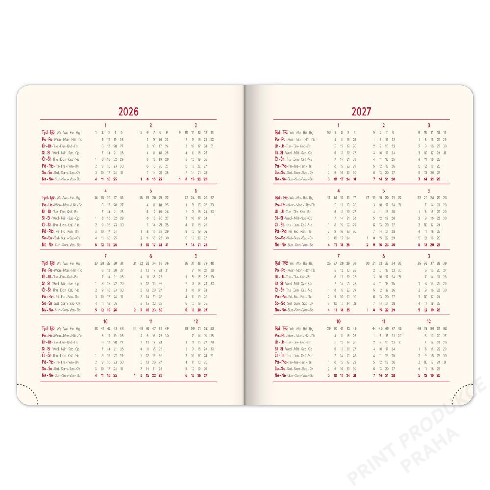 - Diář obsahuje: místo pro osobní údaje, měsíční plánování 2026 a 2027, - roční plánování 2026 a 2027, pracovní plánovací kalendář, mapa ČR a SK, - svátky ČR/ SK + mezinárodní svátky, rozšířený seznam českých jmen. - - Součástí je ražba roku, gumička na zavření a poutko na pero. - Vhodný pro ražbu, ražbu přes folii a barevnou ražbu.