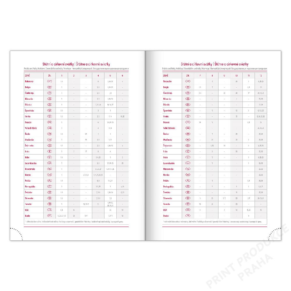 Rozměr: 15 x 21 cm - Formát: A5 - Kalendárium: 6jazyčné denní (CZ, SK, EN, DE, HU, RU) - Počet stran: 352 stran - Potahový materiál: hladká matná koženka - Vazba: tuhá knižní - Barva bloku: bílá - - Diář obsahuje: místo pro osobní údaje, měsíční plánování 2026 a 2027, - roční plánování 2026 a 2027, pracovní plánovací kalendář, mapa ČR a SK, - svátky ČR/ SK + mezinárodní svátky, rozšířený seznam českých jmen. - - Součástí je ražba roku a poutko na pero. - Vhodný pro ražbu, ražbu přes folii, barevnou ražbu a potisk.