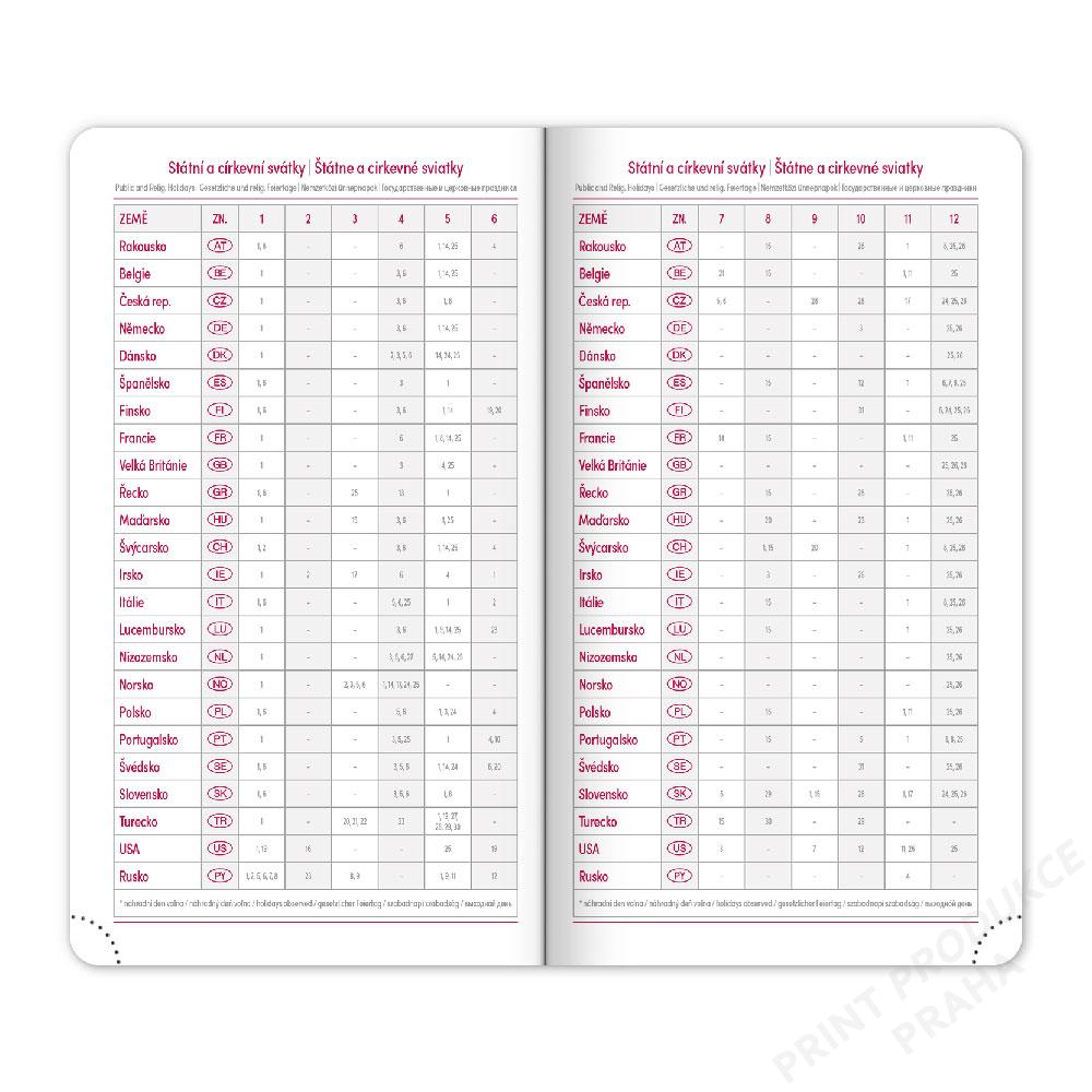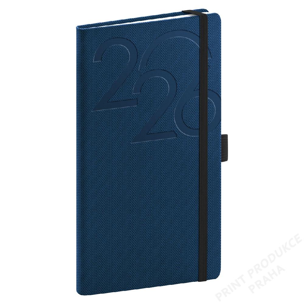 Rozměr: 9 x 15,5 cm - Formát: kapesní - Kalendárium: 6jazyčné týdenní (CZ, SK, EN, DE, HU, RU) - Počet stran: 128 stran - Potahový materiál: jemně strukturovaná koženka - Vazba: tuhá knižní - Barva bloku: bílá - - Diář obsahuje: místo pro osobní údaje, - roční plánování 2026 a 2027, pracovní plánovací kalendář, - svátky ČR/ SK + mezinárodní svátky, rozšířený seznam českých jmen. - - Součástí je ražba roku, gumička na zavření a poutko na pero. - Vhodný pro ražbu, ražbu přes folii a barevnou ražbu.