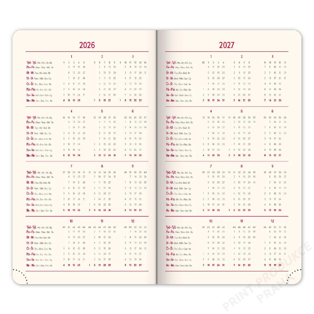 - Diář obsahuje: místo pro osobní údaje, - roční plánování 2026 a 2027, pracovní plánovací kalendář, - svátky ČR/ SK + mezinárodní svátky, rozšířený seznam českých jmen. - - Součástí je ražba roku, gumička na zavření a poutko na pero. - Vhodný pro ražbu, ražbu přes folii a barevnou ražbu.