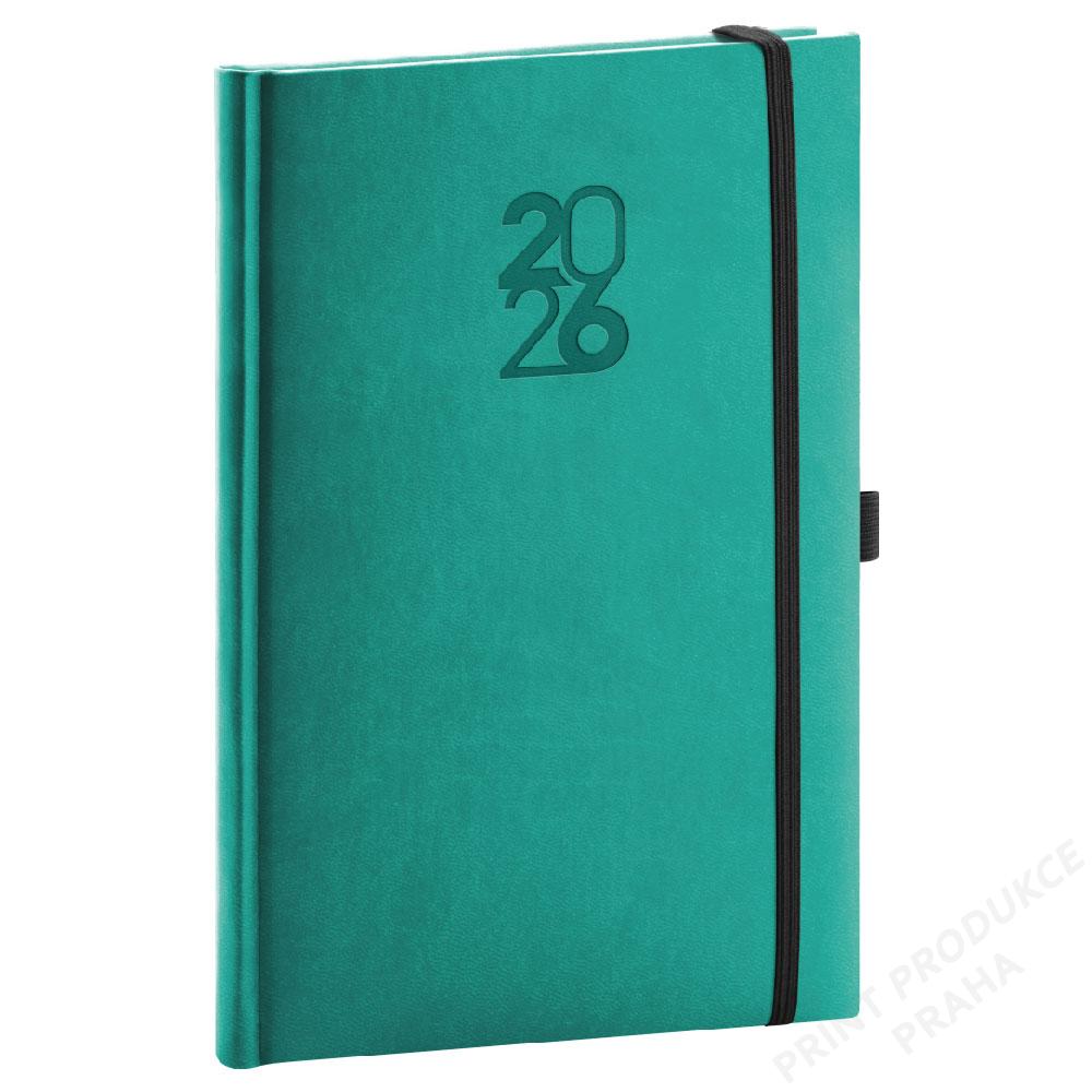 Rozměr: 15 x 21 cm - Formát: A5 - Kalendárium: 6jazyčné týdenní (CZ, SK, EN, DE, HU, RU) - Počet stran: 144 stran - Potahový materiál: hladká matná koženka - Vazba: tuhá knižní - Barva bloku: bílá - - Diář obsahuje: místo pro osobní údaje, měsíční plánování 2026 a 2027, - roční plánování 2026 a 2027, pracovní plánovací kalendář, mapa ČR a SK, - svátky ČR/ SK + mezinárodní svátky, rozšířený seznam českých jmen. - - Součástí je ražba roku, gumička na zavření a poutko na pero. - Vhodný pro ražbu, ražbu přes folii, barevnou ražbu a potisk.