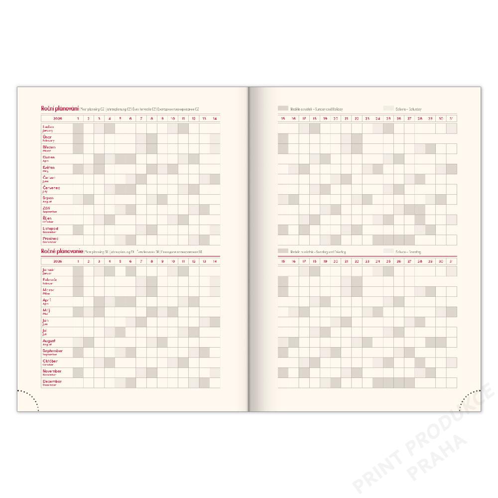 - Diář obsahuje: místo pro osobní údaje, měsíční plánování 2026 a 2027, - roční plánování 2026 a 2027, pracovní plánovací kalendář, mapa ČR a SK, - svátky ČR/ SK + mezinárodní svátky, rozšířený seznam českých jmen. - - Součástí je ražba roku, gumička na zavření a poutko na pero. - Vhodný pro ražbu, ražbu přes folii a barevnou ražbu.