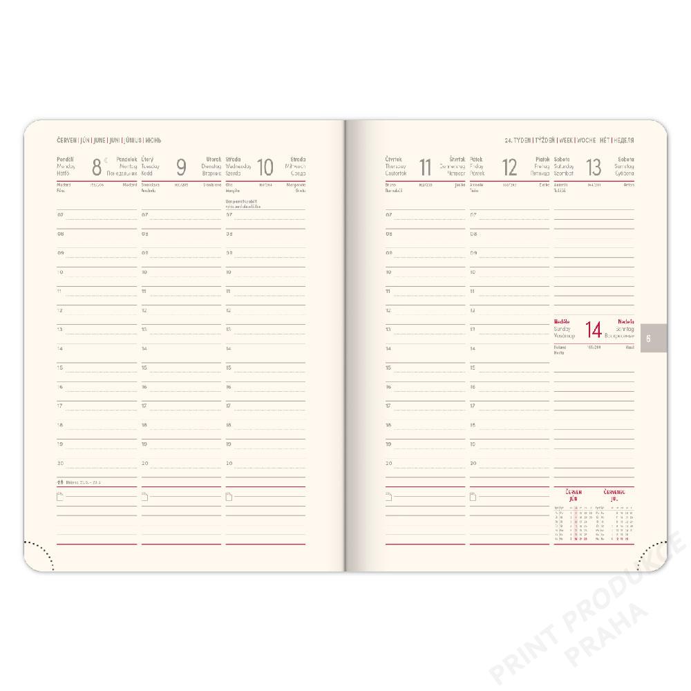 Rozměr: 15 x 21 cm - Formát: A5 - Kalendárium: 6jazyčné týdenní (CZ, SK, EN, DE, HU, RU) - Počet stran: 144 stran - Potahový materiál: jemně strukturovaná koženka/metalická jemná struktura