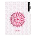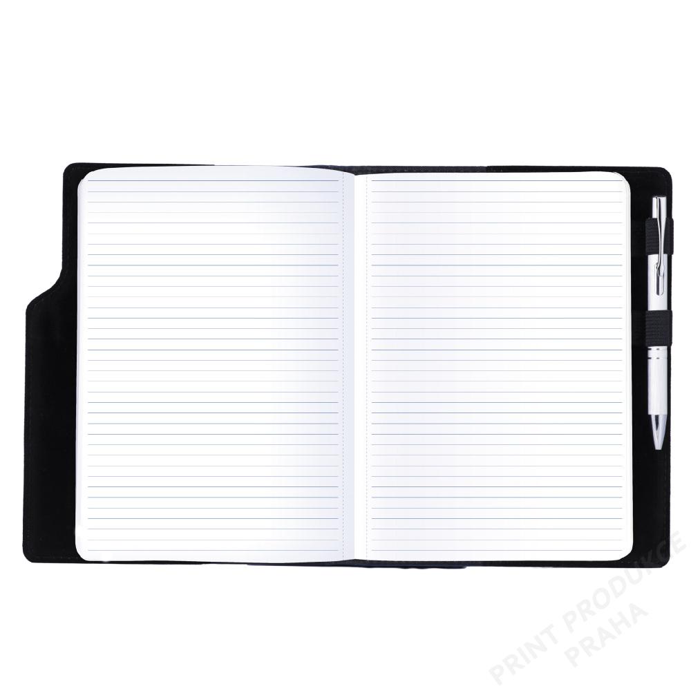 Formát: B5 - Rozměr: 170 x 240 mm - Potahový materiál: matná strukturovaná koženka - Vnitřní materiál: černý samet - Barva bloku: bílá - Záložka: bílá - Papír: linkovaný s perforací - Počet stran: 144 - Vazba: šitá V8 (tkaná niť) - Součástí notesu je propiska