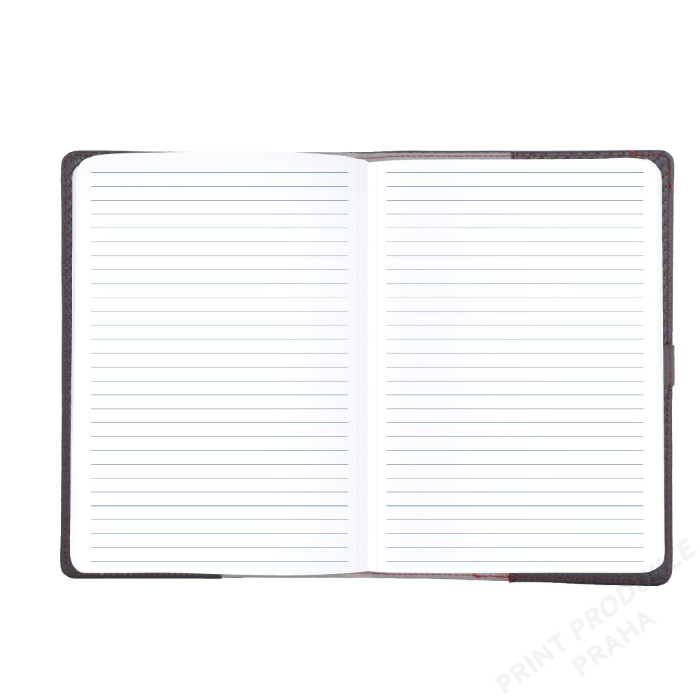 Formát: B6 - Rozměr: 120 x 165 mm - Potahový materiál: strukturovaná koženka - Vazba: šitá V8 (tkaná niť) - Barva bloku: bílá - Papír: linkovaný s perforací - Záložka: bílá - Počet stran: 144 - Součástí je gumička na zavírání