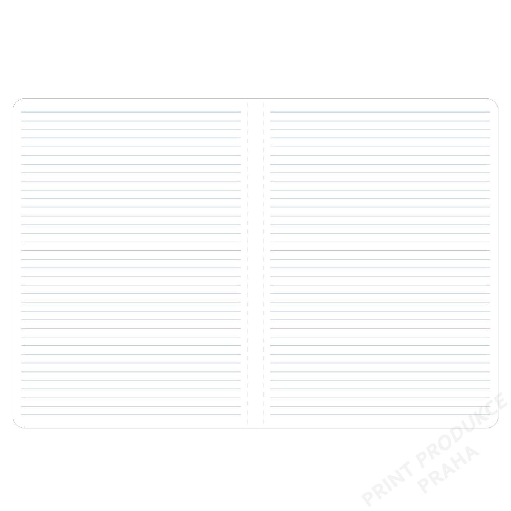 Formát: A5 - Rozměr: 143 x 206 mm - Barva bloku: bílá - Záložka: bílá - Papír: linkovaný perforací - Počet stran: 144 - Vazba: šitá V8 (tkaná niť) - Materiál vnější: pěnová výplň desky potažená hladkou koženkou s natištěnou grafikou - Materiál vnitřní: černý samet - - Součástí notesu je poutko na propisku a kovová propiska.