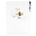 Formát: A4 - Rozměr: 210 x 293 mm - Barva bloku: bílá - Záložka: bílá - Papír: čtverečkovaný perforací - Počet stran: 144 - Vazba: šitá V8 (tkaná niť) - Materiál vnější: pěnová výplň desky potažená hladkou koženkou s natištěnou grafikou - Materiál vnitřní: černý samet - - Součástí notesu je poutko na propisku a kovová propiska.