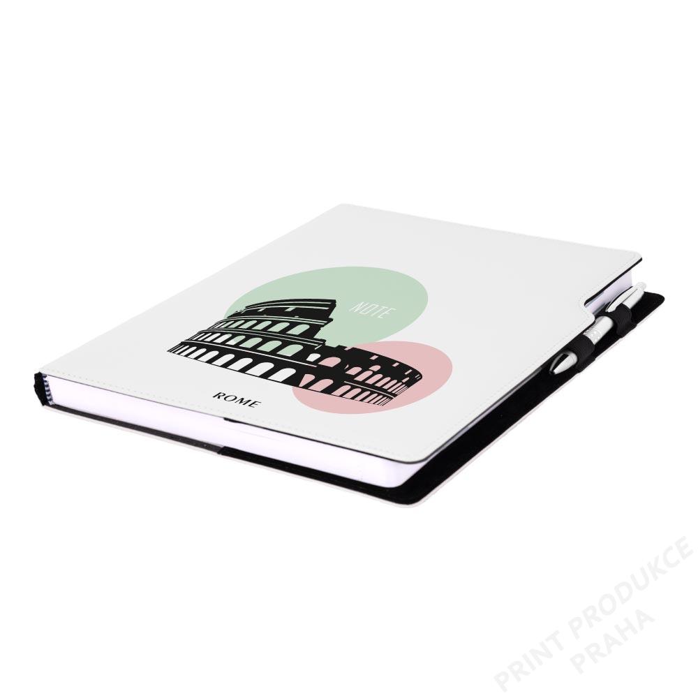 Formát: A4 - Rozměr: 210 x 293 mm - Barva bloku: bílá - Záložka: bílá - Papír: tečkovaný s perforací - Počet stran: 144 - Vazba: šitá V8 (tkaná niť) - Materiál vnější: pěnová výplň desky potažená hladkou koženkou s natištěnou grafikou - Materiál vnitřní: černý samet - - Součástí notesu je poutko na propisku a kovová propiska.