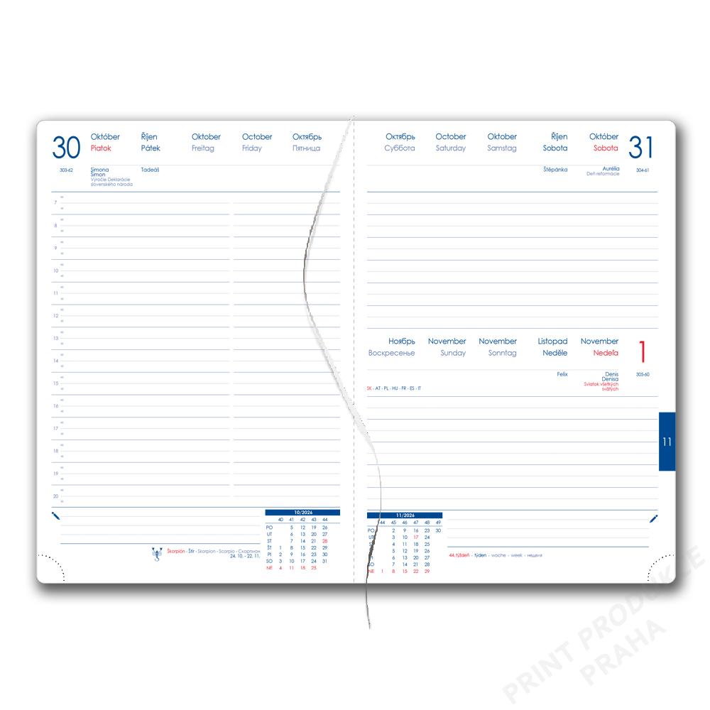 Blok vkládaný do desek diáře - Rozsah: 354 stran - Vazba: šitá V8 (tkaná nit) - Kalendárium: denní slovenské jmenné - Jazykové mutace: SK, CZ, EN, DE, RU - Barva bloku: bílá - Barva písma: modrá a červená - Diář obsahuje: kulaté odtrhávací rožky, bílou záložku a propisku - Materiál vnější: pěnová výplň desky potažená lesklou hladkou koženkou - Materiál vnitřní: černý samet - - Obsah kalendária: znamení zvěrokruhu, přehledný kalendář, plánovací kalendář 2026, - roční plánovací kalendář SK a CZ, přehled přiznání a plateb daní SK a CZ, - mezinárodní tel. spojení, SK křestní jména, časová pásma, - státní a církevní svátky ve světě, vzdálenosti v km EU/SK/CZ, - plánovací kalendář 2027, poznámky, mapy - SK, ČR, Praha, Bratislava. - - Součástí je sleporažba letopočtu. - Diář je vhodný pro ražbu, barevnou ražbu či potisk.