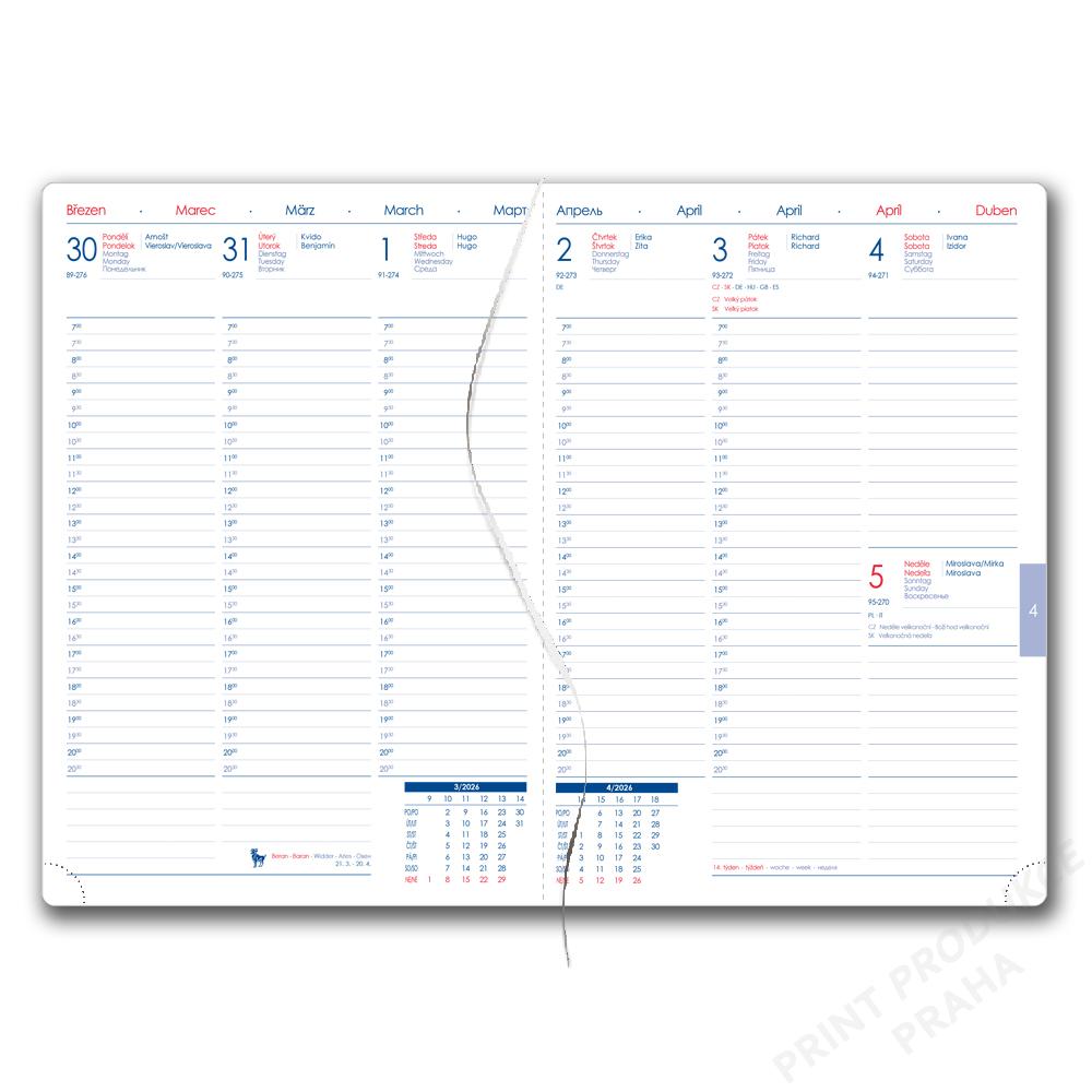 - Obsah kalendária: znamení zvěrokruhu, přehledný kalendář, - plánovací kalendář 2026, roční plánovací kalendář CZ a SK, - přehled přiznání a plateb daní CZ a SK, poznámky, - mezinárodní tel. spojení, CZ křestní jména, časová pásma, - státní a církevní svátky ve světě, vzdálenosti v km EU/CZ/SK, - plánovací kalendář 2027, mapy - ČR, SK, Praha, Bratislava. - - Součástí je sleporažba letopočtu. - Diář je vhodný pro ražbu, barevnou ražbu či potisk.