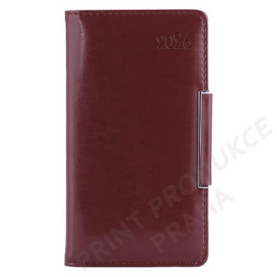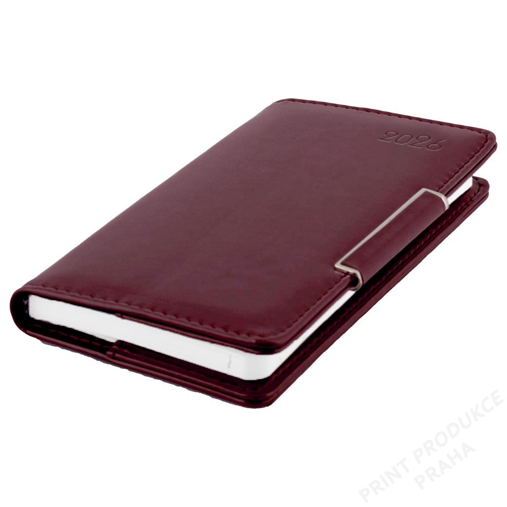 Rozsah: 140 stran - Vazba: šitá V8 (tkaná nit) - Kalendárium: týdenní české jmenné - Jazykové mutace: CZ, SK, EN, DE, RU - Barva bloku: bílá - Barva písma: modrá a červená - Diář obsahuje: kulaté odtrhávací rožky a bílou záložku - Materiál: pěnová výplň desky potažená hladkou koženkou s kovovou ozdobou - - Obsah kalendária: znamení zvěrokruhu, přehledný kalendář, - plánovací kalendář 2026, roční plánovací kalendář CZ a SK, - přehled přiznání a plateb daní CZ a SK, mezinárodní tel. spojení, - státní a církevní svátky ve světě, CZ křestní jména, - vzdálenosti v km EU/CZ/SK, plánovací kalendář 2027, - poznámky, časová pásma - - Součástí je sleporažba letopočtu. - Diář je vhodný pro sleporažbu, barevnou ražbu či potisk.