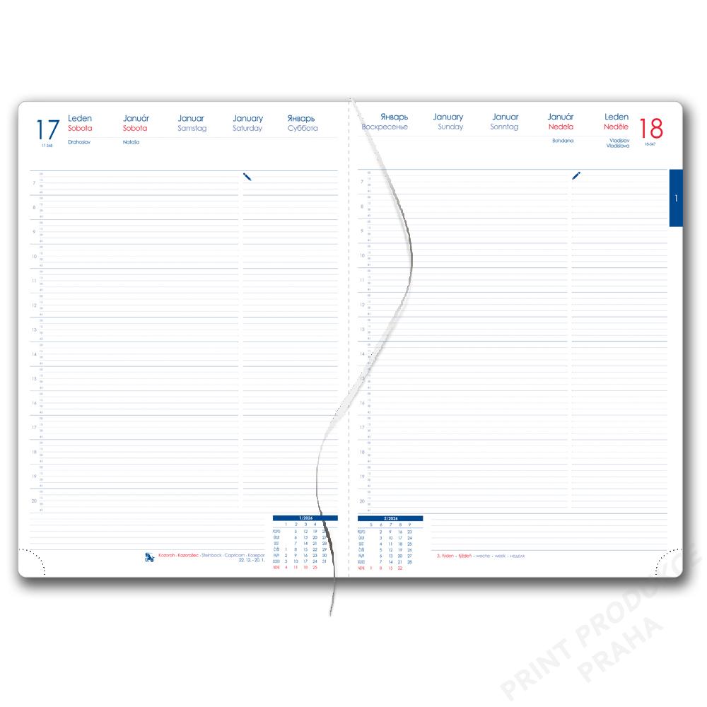 Formát: A4 - Rozměr bloku: 210 x 293 mm (Blok vkládaný do desek diáře) - Rozsah: 404 stran - Vazba: šitá V8 (tkaná nit) - Kalendárium: denní české a slovenské (SO/NE zvlášť na stránce) - Jazykové mutace: CZ, SK, EN, DE, RU - Barva bloku: bílá - Barva písma: modrá a červená - Diář obsahuje: kulaté odtrhávací rožky, bílou záložku a propisku - Materiál vnější: pěnová výplň desky potažená hladkou koženkou s natištěnou grafikou - Materiál vnitřní: černý samet - - Obsah kalendária: znamení zvěrokruhu, přehledný kalendář, plánovací kalendář 2026, - roční plánovací kalendář CZ a SK, přehled přiznání a plateb daní CZ a SK, - mezinárodní tel. spojení, CZ/SK křestní jména, časová pásma, - státní a církevní svátky ve světě, vzdálenosti v km EU/CZ/SK, - plánovací kalendář 2027, poznámky, mapy - ČR, SK, Praha, Bratislava. - - -