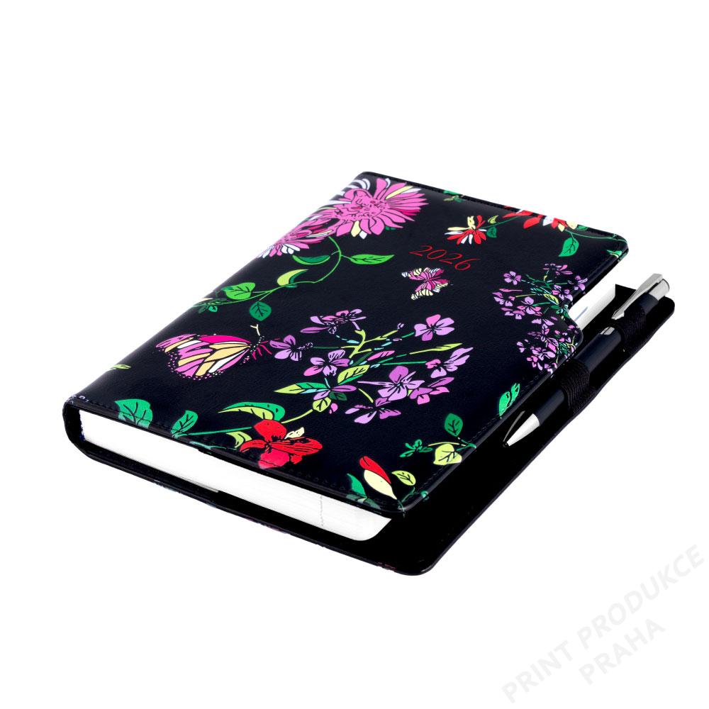 Diář DESIGN denní A5 2026 slovenský - černá - Květy
