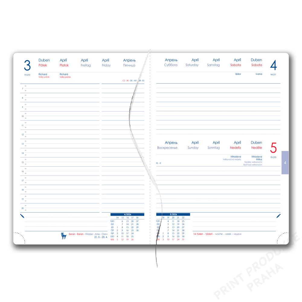 Formát: B6 - Rozměr bloku: 120 x 165 mm (Blok vkládaný do desek diáře) - Rozsah: 352 stran - Vazba: šitá V8 (tkaná nit) - Kalendárium: denní české a slovenské jmenné - Jazykové mutace: CZ, SK, EN, DE, RU - Barva bloku: bílá - Barva písma: modrá a červená - Diář obsahuje: kulaté odtrhávací rožky, bílou záložku a propisku - Materiál vnější: pěnová výplň desky potažená hladkou koženkou s natištěnou grafikou - Materiál vnitřní: černý samet - - Obsah kalendária: znamení zvěrokruhu, přehledný kalendář, plánovací kalendář 2026, - roční plánovací kalendář CZ a SK, přehled přiznání a plateb daní CZ a SK, - mezinárodní tel. spojení, CZ/SK křestní jména, časová pásma, - státní a církevní svátky ve světě, vzdálenosti v km EU/CZ/SK, - plánovací kalendář 2027, poznámky, mapy - ČR, SK, Praha, Bratislava. - - -