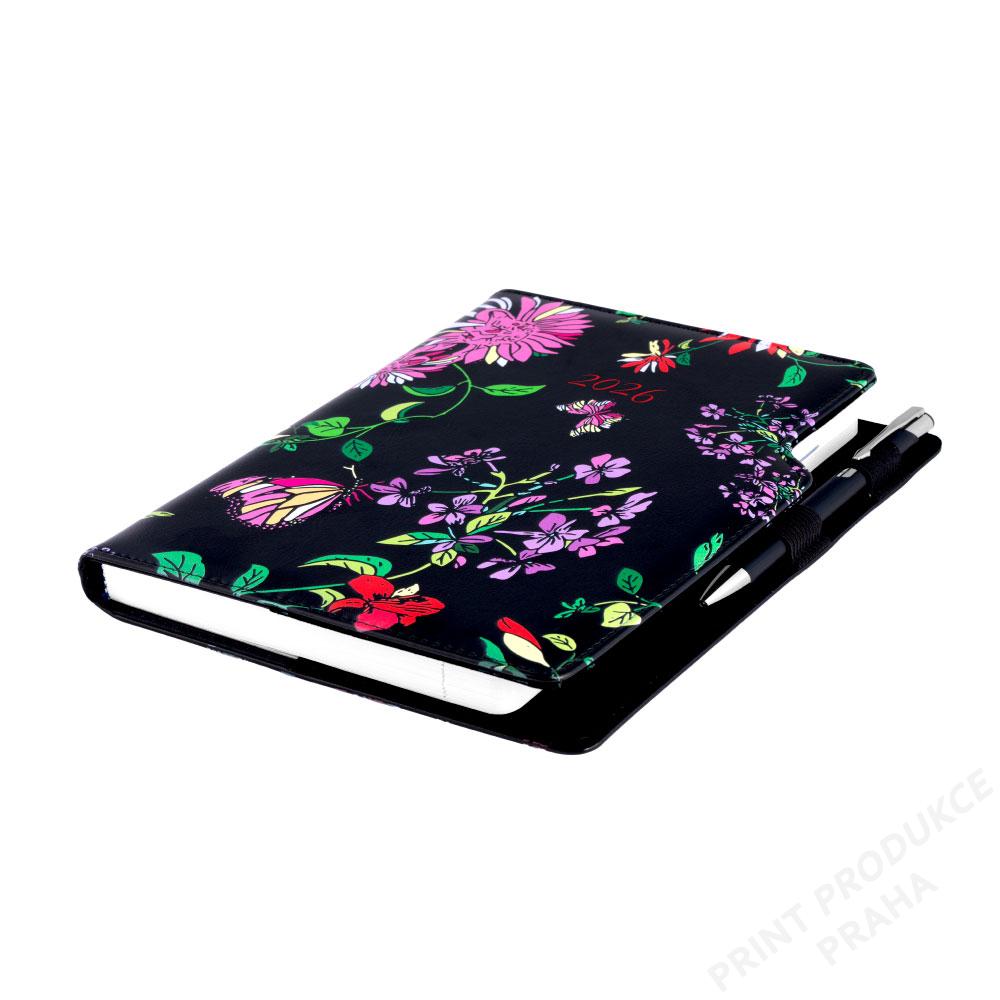 Diář DESIGN týdenní B5 2026 - černá - Květy