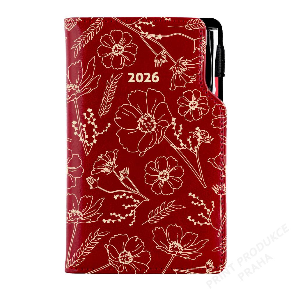 Diář DESIGN týdenní kapesní 2026 český - bordó - Květiny