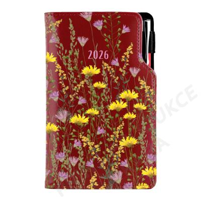 Formát: kapesní - Rozměr bloku: 80 x 150 mm - Rozsah: 140 stran - Vazba: šitá V8 (tkaná nit) - Kalendárium: týdenní české jmenné - Jazykové mutace: CZ, SK, EN, DE, RU - Barva bloku: bílá - Barva písma: modrá a červená - Diář obsahuje: kulaté odtrhávací rožky, bílou záložku a propisku - Materiál vnější: pěnová výplň desky potažená hladkou koženkou s natištěnou grafikou - Materiál vnitřní: černý samet - - Obsah kalendária: znamení zvěrokruhu, přehledný kalendář, - plánovací kalendář 2026, roční plánovací kalendář CZ a SK, - přehled přiznání a plateb daní CZ a SK, mezinárodní tel. spojení, - státní a církevní svátky ve světě, CZ křestní jména, - vzdálenosti v km EU/CZ/SK, plánovací kalendář 2027, - poznámky, časová pásma. - - -