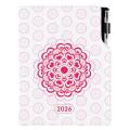 Formát: A5 - Rozměr bloku: 143 x 206 mm (Blok vkládaný do desek diáře) - Rozsah: 140 stran - Vazba: šitá V8 (tkaná nit) - Kalendárium: týdenní jmenné CZ/SK na jedné straně + samostatná strana na poznámky - Jazykové mutace: CZ, SK, EN, DE, RU - Barva bloku: bílá - Barva písma: modrá a červená - Diář obsahuje: kulaté odtrhávací rožky, bílou záložku a propisku - Materiál vnější: pěnová výplň desky potažená hladkou koženkou s natištěnou grafikou - Materiál vnitřní: černý samet - - Obsah kalendária: znamení zvěrokruhu, přehledný kalendář, plánovací kalendář 2026, - roční plánovací kalendář CZ a SK, přehled přiznání a plateb daní CZ a SK, - mezinárodní tel. spojení, CZ/SK křestní jména, časová pásma, - státní a církevní svátky ve světě, vzdálenosti v km EU/CZ/SK, - plánovací kalendář 2027, poznámky, mapy - ČR, SK, Praha, Bratislava. - - -