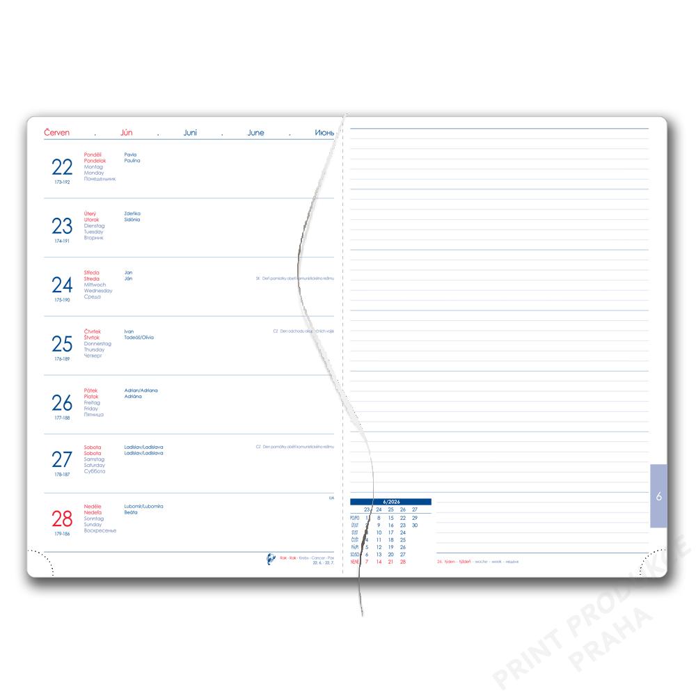 Formát: A5 - Rozměr bloku: 143 x 206 mm (Blok vkládaný do desek diáře) - Rozsah: 140 stran - Vazba: šitá V8 (tkaná nit) - Kalendárium: týdenní jmenné CZ/SK na jedné straně + samostatná strana na poznámky - Jazykové mutace: CZ, SK, EN, DE, RU - Barva bloku: bílá - Barva písma: modrá a červená - Diář obsahuje: kulaté odtrhávací rožky, bílou záložku a propisku - Materiál vnější: pěnová výplň desky potažená hladkou koženkou s natištěnou grafikou - Materiál vnitřní: černý samet - - Obsah kalendária: znamení zvěrokruhu, přehledný kalendář, plánovací kalendář 2026, - roční plánovací kalendář CZ a SK, přehled přiznání a plateb daní CZ a SK, - mezinárodní tel. spojení, CZ/SK křestní jména, časová pásma, - státní a církevní svátky ve světě, vzdálenosti v km EU/CZ/SK, - plánovací kalendář 2027, poznámky, mapy - ČR, SK, Praha, Bratislava. - - -