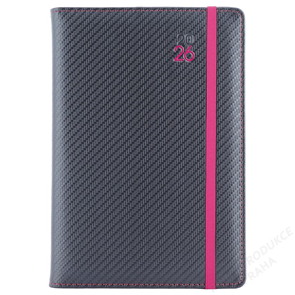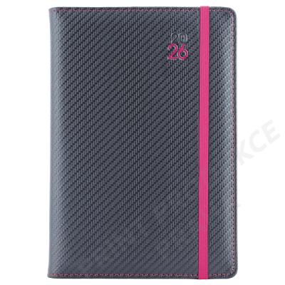 Rozsah: 140 stran - Vazba: šitá V8 (tkaná nit) - Kalendárium: týdenní jmenné CZ/SK na jedné straně + strana na poznámky - Jazyky: CZ, SK, EN, DE, RU - Barva bloku: bílá - Barva písma: modrá a červená - Diář obsahuje: kulaté odtrhávací rožky,bílou záložku, - poutko na propisku a gumičku za zavírání - Materiál: pevné desky potaženy vzorovanou matnou koženkou - - Obsah kalendária: znamení zvěrokruhu, přehledný kalendář, - plánovací kalendář 2026, roční plánovací kalendář CZ a SK, - přehled přiznání a plateb daní CZ a SK, časová pásma, - mezinárodní tel. spojení, CZ/SK křestní jména, poznámky, - státní a církevní svátky ve světě, vzdálenosti v km EU/CZ/SK, - plánovací kalendář 2027, mapy - ČR, SK, Praha, Bratislava. - - Součástí je barevná ražba letopočtu. - Diář je vhodný pro sleporažbu a barevnou ražbu.