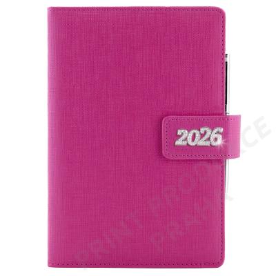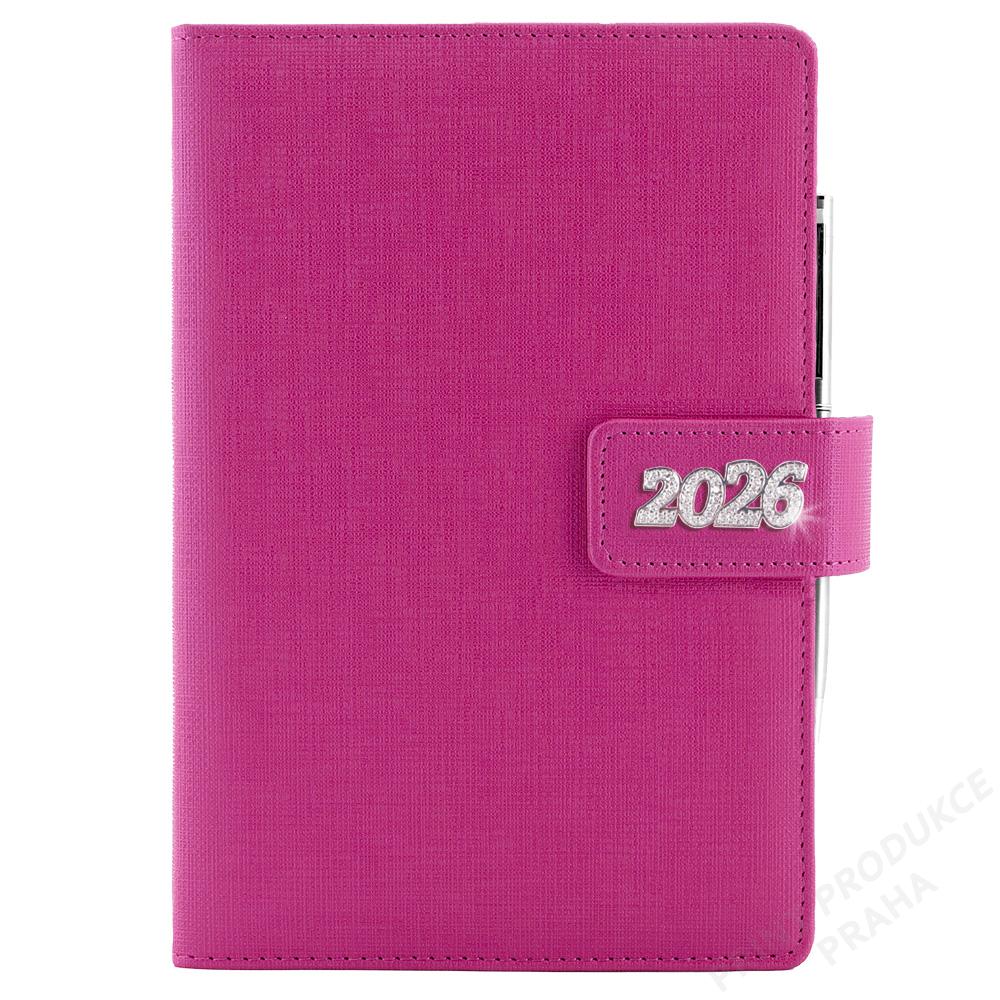 Rozsah: 350 stran - Vazba: šitá V8 (tkaná nit) - Kalendárium: denní české jmenné - Jazykové mutace: CZ, SK, EN, DE, RU - Barva bloku: bílá - Barva písma: modrá a červená - Diář obsahuje: kulaté odtrhávací rožky, bílou záložku, - kovovou propisku a magnetické zavírání - Potahový materiál: koženka - - Obsah kalendária: znamení zvěrokruhu, přehledný kalendář, - plánovací kalendář 2026, roční plánovací kalendář CZ a SK, - přehled přiznání a plateb daní CZ a SK, - mezinárodní tel. spojení, CZ křestní jména, časová pásma, - státní a církevní svátky ve světě, vzdálenosti v km EU/CZ/SK, - plánovací kalendář 2027, poznámky, mapy - ČR, SK, Praha, Bratislava. - - Šperk letopočtu je vyroben z niklu a v něm jsou vsazeny krystalky. - Diář je balen v dárkové krabičce vystlané saténem.