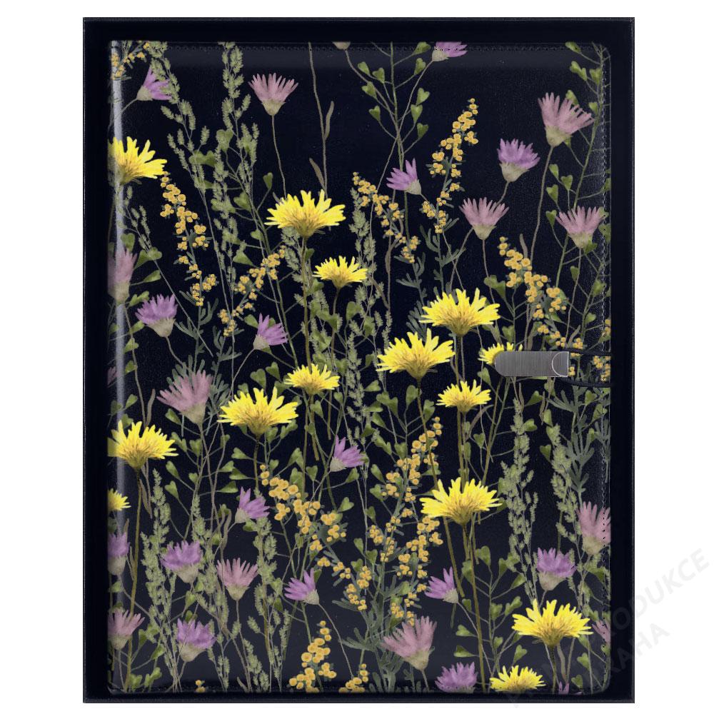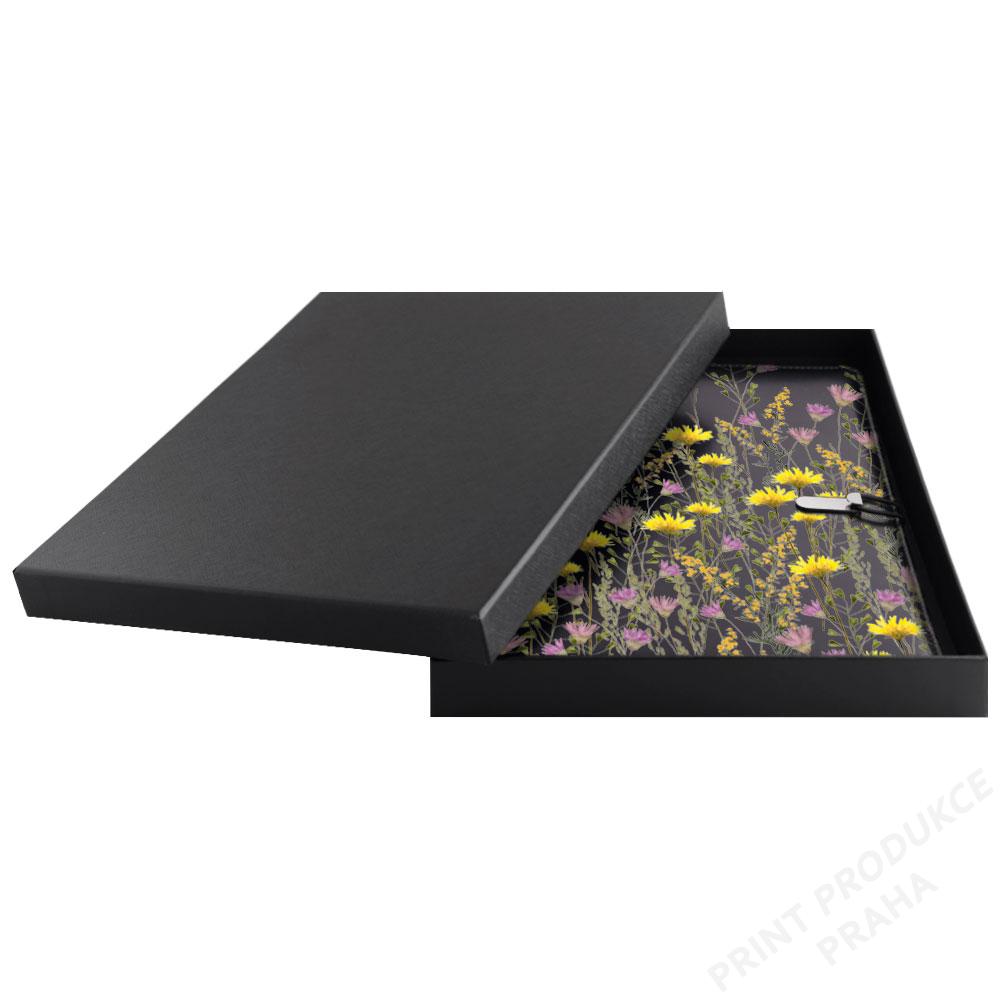 GEP konferenční desky na dokumenty v dárkové krabičce černé - Louka s linkovaným blokem - Tyto desky jsou ideálním pomocníkem k pořizování poznámek. - Jsou vhodné také jako reprezentativní dárek zabalený v luxusní krabičce. - Do desek GEP je možno dokupovat další náhradní bloky. - Jsou vhodné k reklamní ražbě log, k potisku, ke gravírování atd… - Na desky umíme jako jediní na světě i plnobarevnou ražbu. - Jsou vybaveny estetickým zapínáním na gumičku s kovovým štítkem. - Bloky do desek je možno vyrobit na zakázku s grafikou klienta. (od 100 ks) - Propisku můžeme na přání potisknout. - Na zakázku můžeme desky vyrobit i z jiných potahových materiálů a barev. - - - Konferenční desky GEP standardně obsahují: - - Koženkové desky o rozměru 24,5 x 31,5 cm (vnější rozměr) - - linkovaný A4 s 50 ti stranami - - zapínání na gumičku s kovovým štítkem - - vnitřní přihrádku na dokumenty - - 2 x přihrádku na karty, vizitky aj. - - 2 x poutko na propisku - - luxusní dárkovou krabičku vhodnou k potisku