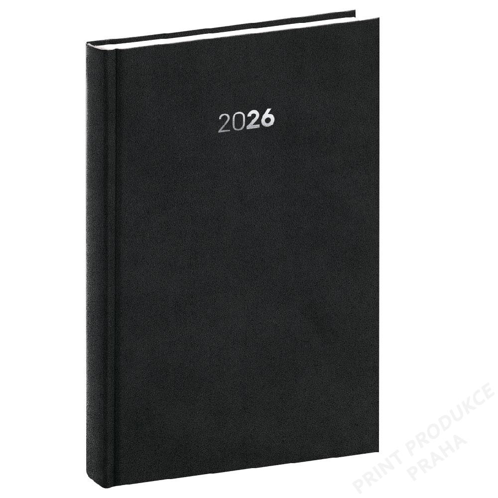 Rozměr: 15 x 21 cm - Formát: A5 - Kalendárium: 6jazyčné denní (CZ, SK, EN, DE, HU, RU) - Počet stran: 352 stran - Potahový materiál: hladká matná koženka - Vazba: tuhá knižní - Barva bloku: bílá - - Diář obsahuje: místo pro osobní údaje, měsíční plánování 2026 a 2027, - roční plánování 2026 a 2027, pracovní plánovací kalendář, mapa ČR a SK, - svátky ČR/ SK + mezinárodní svátky, rozšířený seznam českých jmen. - - Součástí je ražba roku přes stříbrnou pásku. - Vhodný pro ražbu přes folii a potisk.