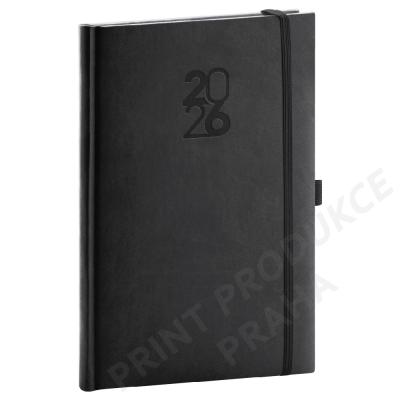 Rozměr: 15 x 21 cm - Formát: A5 - Kalendárium: 6jazyčné týdenní (CZ, SK, EN, DE, HU, RU) - Počet stran: 144 stran - Potahový materiál: hladká matná koženka - Vazba: tuhá knižní - Barva bloku: bílá - - Diář obsahuje: místo pro osobní údaje, měsíční plánování 2026 a 2027, - roční plánování 2026 a 2027, pracovní plánovací kalendář, mapa ČR a SK, - svátky ČR/ SK + mezinárodní svátky, rozšířený seznam českých jmen. - - Součástí je ražba roku, gumička na zavření a poutko na pero. - Vhodný pro ražbu, ražbu přes folii, barevnou ražbu a potisk.