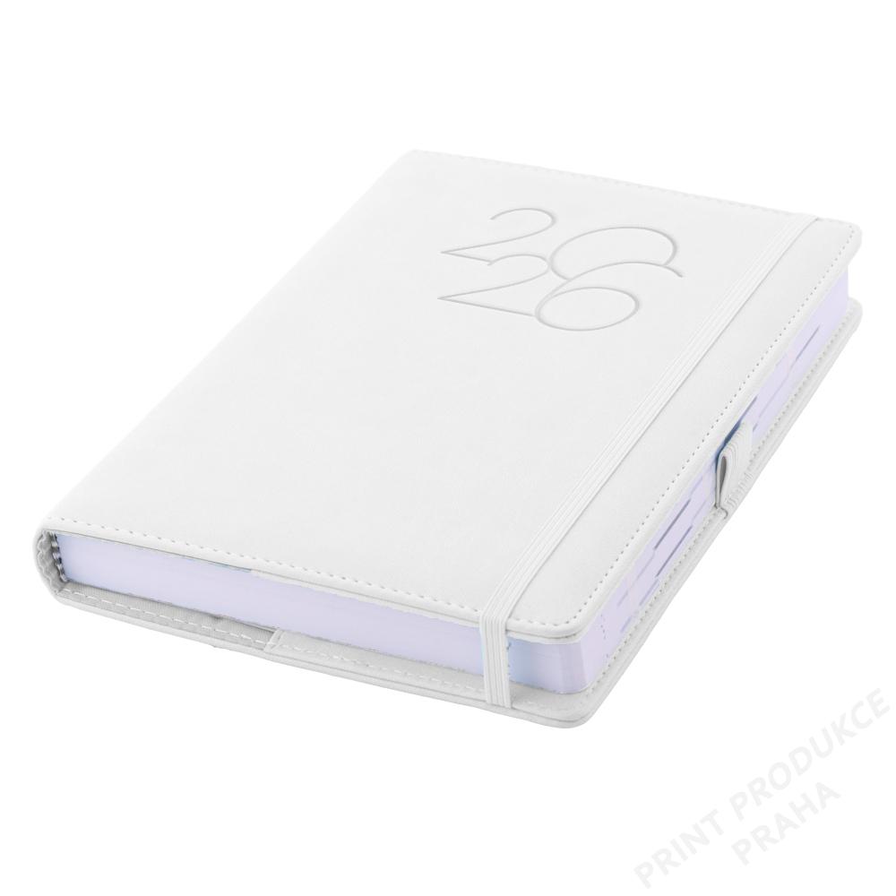 Blok vkládaný do desek diáře - Rozsah: 354 stran - Vazba: šitá V8 (tkaná nit) - Kalendárium: denní slovenské jmenné - Jazykové mutace: SK, CZ, EN, DE, RU - Barva bloku: bílá - Barva písma: modrá a červená - Potahový materiál: matná koženka - Diář obsahuje: kulaté odtrhávací rožky, - bílou záložku, poutko na propisku a gumičku na zavírání - - Obsah kalendária: znamení zvěrokruhu, přehledný kalendář, - plánovací kalendář 2026, roční plánovací kalendář SK a CZ, - přehled přiznání a plateb daní SK a CZ, časová pásma, - mezinárodní tel. spojení, SK křestní jména, poznámky, - státní a církevní svátky ve světě, vzdálenosti v km EU/SK/CZ, - plánovací kalendář 2027, mapy - SK, ČR, Praha, Bratislava. - - Diář je vhodný pro sleporažbu, barevnou ražbu a potisk.