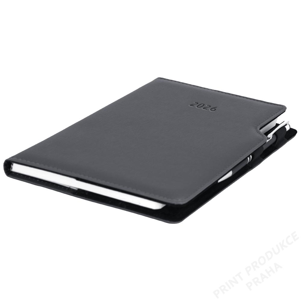 Rozsah: 144 stran - Vazba: šitá V8 (tkaná nit) - Kalendárium: týdenní české a slovenské jmenné - Jazykové mutace: CZ, SK, EN, DE, RU - Barva bloku: bílá - Barva písma: modrá a červená - Diář obsahuje: kulaté odtrhávací rožky, bílou záložku a propisku - Materiál vnější: pěnová výplň desky potažená matnou strukturovanou koženkou - Materiál vnitřní: černý samet - - Obsah kalendária: znamení zvěrokruhu, přehledný kalendář, plánovací kalendář 2026, - roční plánovací kalendář CZ a SK, přehled přiznání a plateb daní CZ a SK, - mezinárodní tel. spojení, CZ/SK křestní jména, časová pásma, - státní a církevní svátky ve světě, vzdálenosti v km EU/CZ/SK, - plánovací kalendář 2027, poznámky, mapy - ČR, SK, Praha, Bratislava. - - Součástí je sleporažba letopočtu. - Diář je vhodný pro sleporažbu, ražbu přes folii nebo barevnou ražbu.