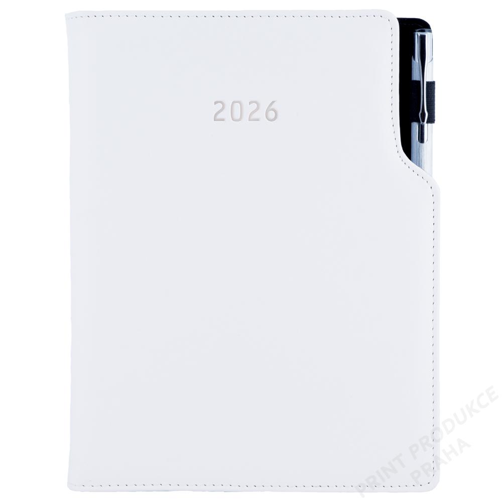 Rozsah: 144 stran - Vazba: šitá V8 (tkaná nit) - Kalendárium: týdenní české a slovenské jmenné - Jazykové mutace: CZ, SK, EN, DE, RU - Barva bloku: bílá - Barva písma: modrá a červená - Diář obsahuje: kulaté odtrhávací rožky, bílou záložku a propisku - Materiál vnější: pěnová výplň desky potažená lesklou hladkou koženkou - Materiál vnitřní: černý samet - - Obsah kalendária: znamení zvěrokruhu, přehledný kalendář, plánovací kalendář 2026, - roční plánovací kalendář CZ a SK, přehled přiznání a plateb daní CZ a SK, - mezinárodní tel. spojení, CZ/SK křestní jména, časová pásma, - státní a církevní svátky ve světě, vzdálenosti v km EU/CZ/SK, - plánovací kalendář 2027, poznámky, mapy - ČR, SK, Praha, Bratislava. - - Součástí je sleporažba letopočtu. - Diář je vhodný pro ražbu, barevnou ražbu či potisk.