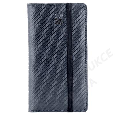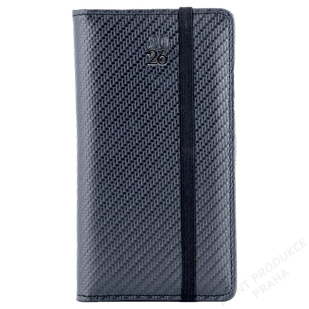 Rozsah: 140 stran - Vazba: šitá V8 (tkaná nit) - Kalendárium: týdenní české jmenné - Jazykové mutace: CZ, SK, EN, DE, RU - Barva bloku: bílá - Barva písma: modrá a červená - Diář obsahuje: kulaté odtrhávací rožky, bílou záložku, - poutko na propisku a gumičku za zavírání - Materiál: pevné desky potaženy vzorovanou matnou koženkou - - Obsah kalendária: znamení zvěrokruhu, přehledný kalendář, - plánovací kalendář 2026, roční plánovací kalendář CZ a SK, - přehled přiznání a plateb daní CZ a SK, mezinárodní tel. spojení, - státní a církevní svátky ve světě, CZ křestní jména, - vzdálenosti v km EU/CZ/SK, plánovací kalendář 2027, - poznámky, časová pásma - - Součástí je barevná ražba letopočtu. - Diář je vhodný pro sleporažbu a barevnou ražbu.