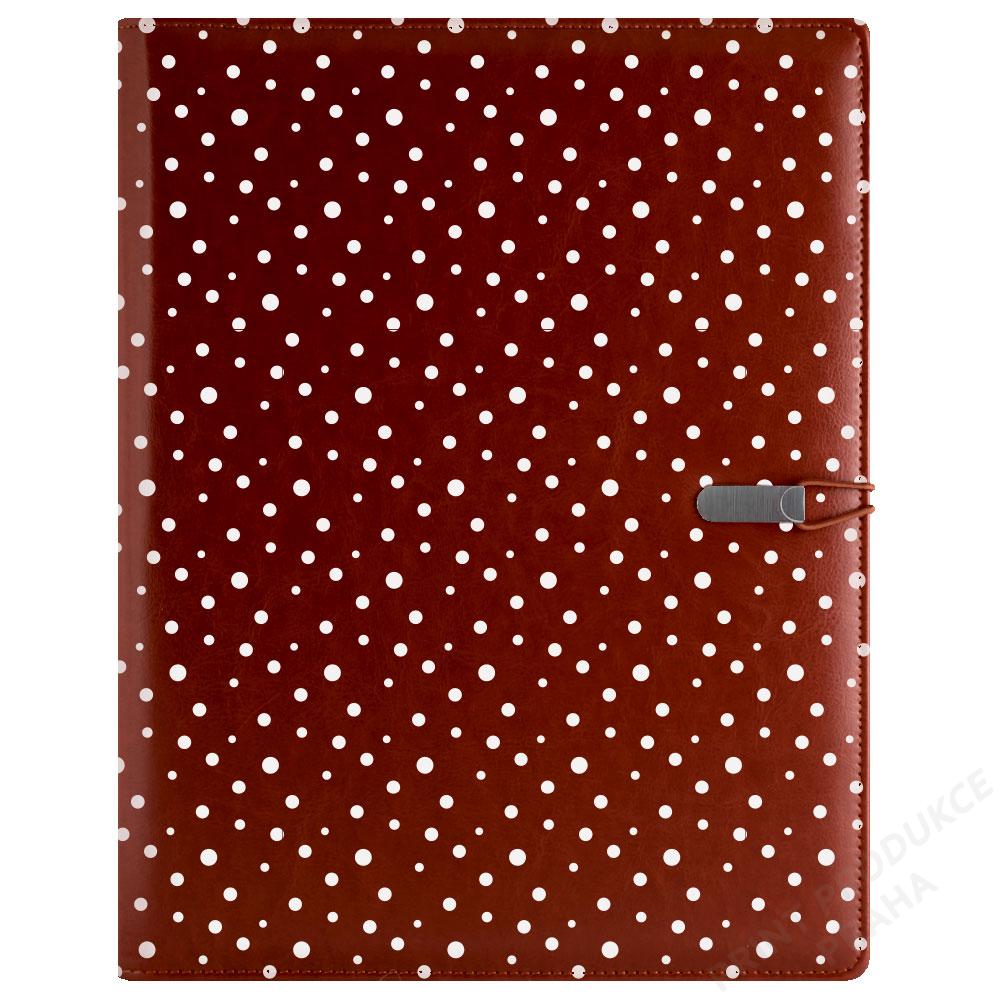 GEP konferenční desky v dárkové krabičce hnědé - puntíky s čistým blokem - Tyto desky jsou ideálním pomocníkem k pořizování poznámek. - Jsou vhodné také jako reprezentativní dárek zabalený v luxusní krabičce. - Do desek GEP je možno dokupovat další náhradní bloky. - Jsou vhodné k reklamní ražbě log, k potisku, ke gravírování atd… - Na desky umíme jako jediní na světě i plnobarevnou ražbu. - Jsou vybaveny estetickým zapínáním na gumičku s kovovým štítkem. - Bloky do desek je možno vyrobit na zakázku s grafikou klienta. (od 100 ks) - Propisku můžeme na přání potisknout. - Na zakázku můžeme desky vyrobit i z jiných potahových materiálů a barev. - - - Konferenční desky GEP standardně obsahují: - - Koženkové desky o rozměru 24,5 x 31,5 cm (vnější rozměr) - - čistý A4 s 50 ti stranami - - zapínání na gumičku s kovovým štítkem - - vnitřní přihrádku na dokumenty - - 2 x přihrádku na karty, vizitky aj. - - 2 x poutko na propisku - - luxusní dárkovou krabičku vhodnou k potisku