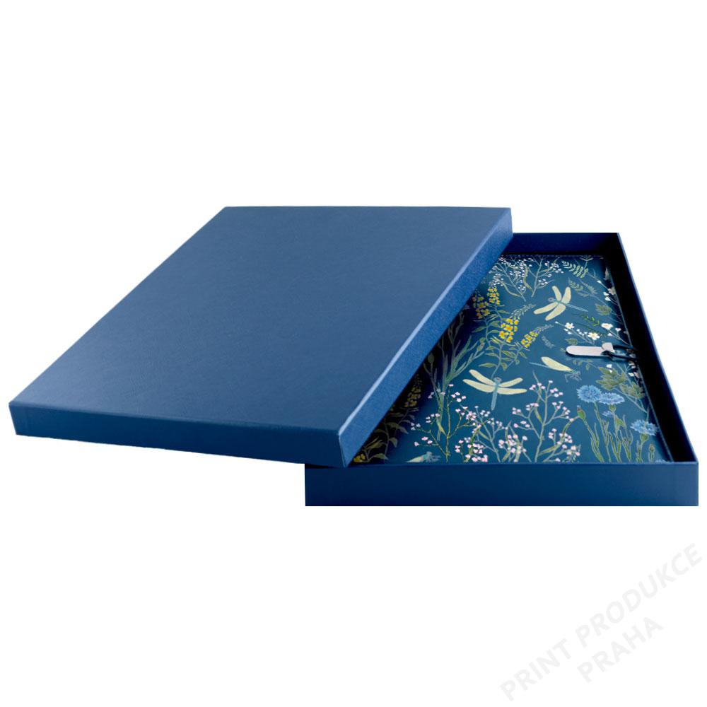 GEP konferenční desky na dokumenty v dárkové krabičce modré - vážky se čtverečkovaným blokem - Tyto desky jsou ideálním pomocníkem k pořizování poznámek. - Jsou vhodné také jako reprezentativní dárek zabalený v luxusní krabičce. - Do desek GEP je možno dokupovat další náhradní bloky. - Jsou vhodné k reklamní ražbě log, k potisku, ke gravírování atd… - Na desky umíme jako jediní na světě i plnobarevnou ražbu. - Jsou vybaveny estetickým zapínáním na gumičku s kovovým štítkem. - Bloky do desek je možno vyrobit na zakázku s grafikou klienta. (od 100 ks) - Propisku můžeme na přání potisknout. - Na zakázku můžeme desky vyrobit i z jiných potahových materiálů a barev. - - - Konferenční desky GEP standardně obsahují: - - Koženkové desky o rozměru 24,5 x 31,5 cm (vnější rozměr) - - čtverečkovaný A4 s 50 ti stranami - - zapínání na gumičku s kovovým štítkem - - vnitřní přihrádku na dokumenty - - 2 x přihrádku na karty, vizitky aj. - - 2 x poutko na propisku - - luxusní dárkovou krabičku vhodnou k potisku