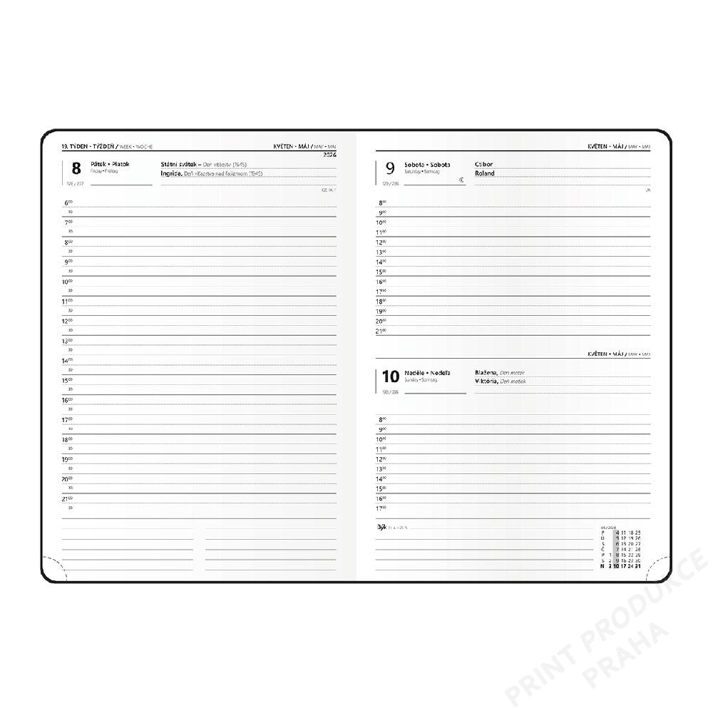 Papír: bílý s perforovanými zakulacenými rožky - Počet stran: 352 - Vazba: šitá vazba V8 - Záložka: bílá stužka - Přední předsádka: mapa ČR + SR - Zadní předsádka: vlepená kapsa - - Kalendárium obsahuje: - časové rozmezí: 6:00 - 21:30,