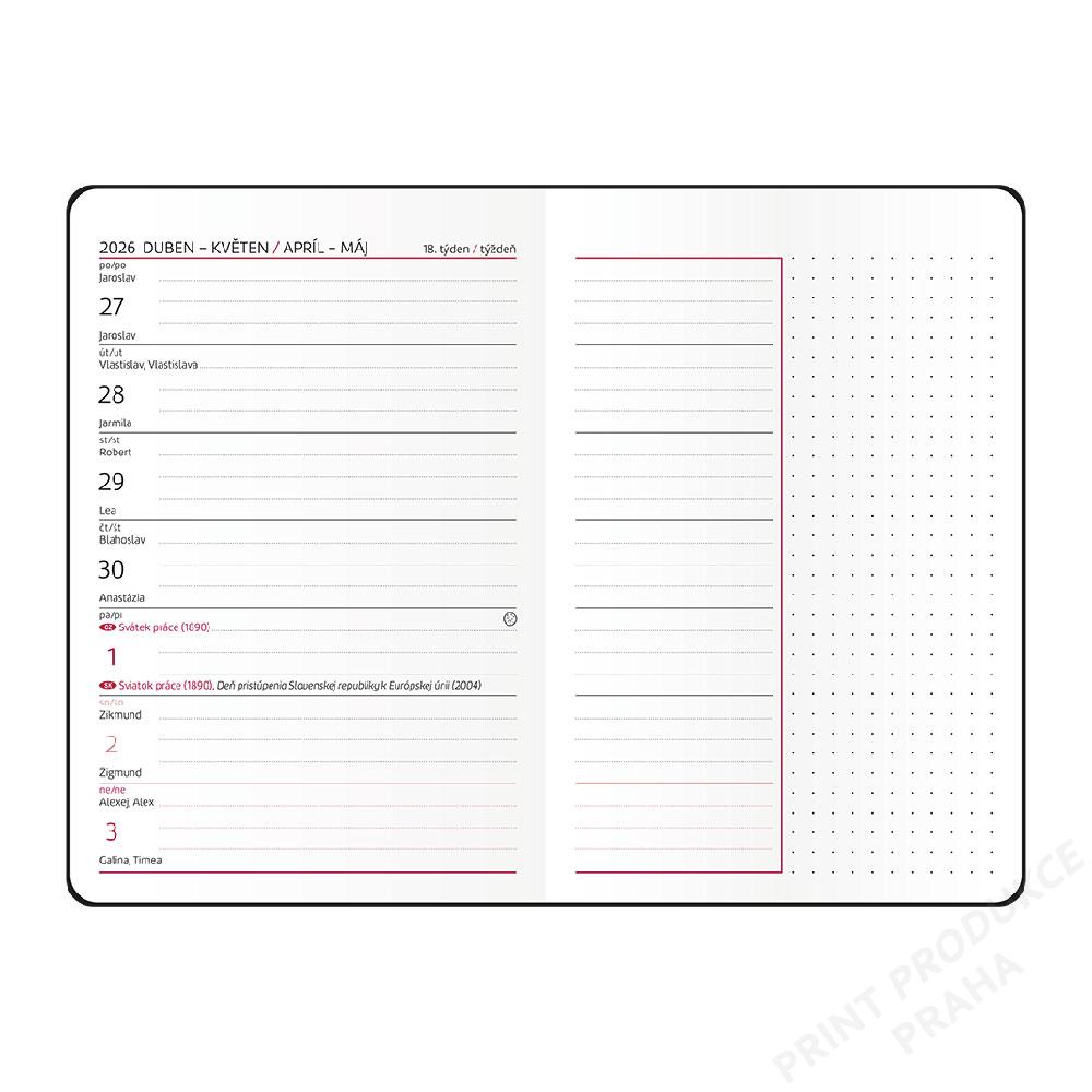 Kalendárium: týdenní české a slovenské jmenné - Jazykové mutace: CZ, SK - Potahový materiál: potažená matným laminem s parciálním lakem,