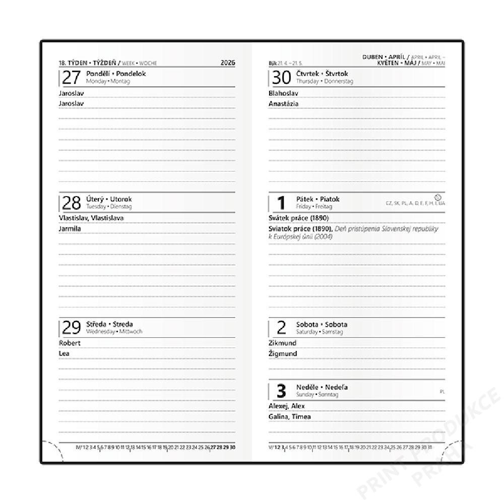 Rozměr: 75 x 150 mm - Formát: kapesní - Kalendárium: týdenní české a slovenské jmenné - Jazykové mutace: CZ, SK, EN, DE