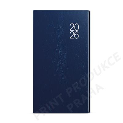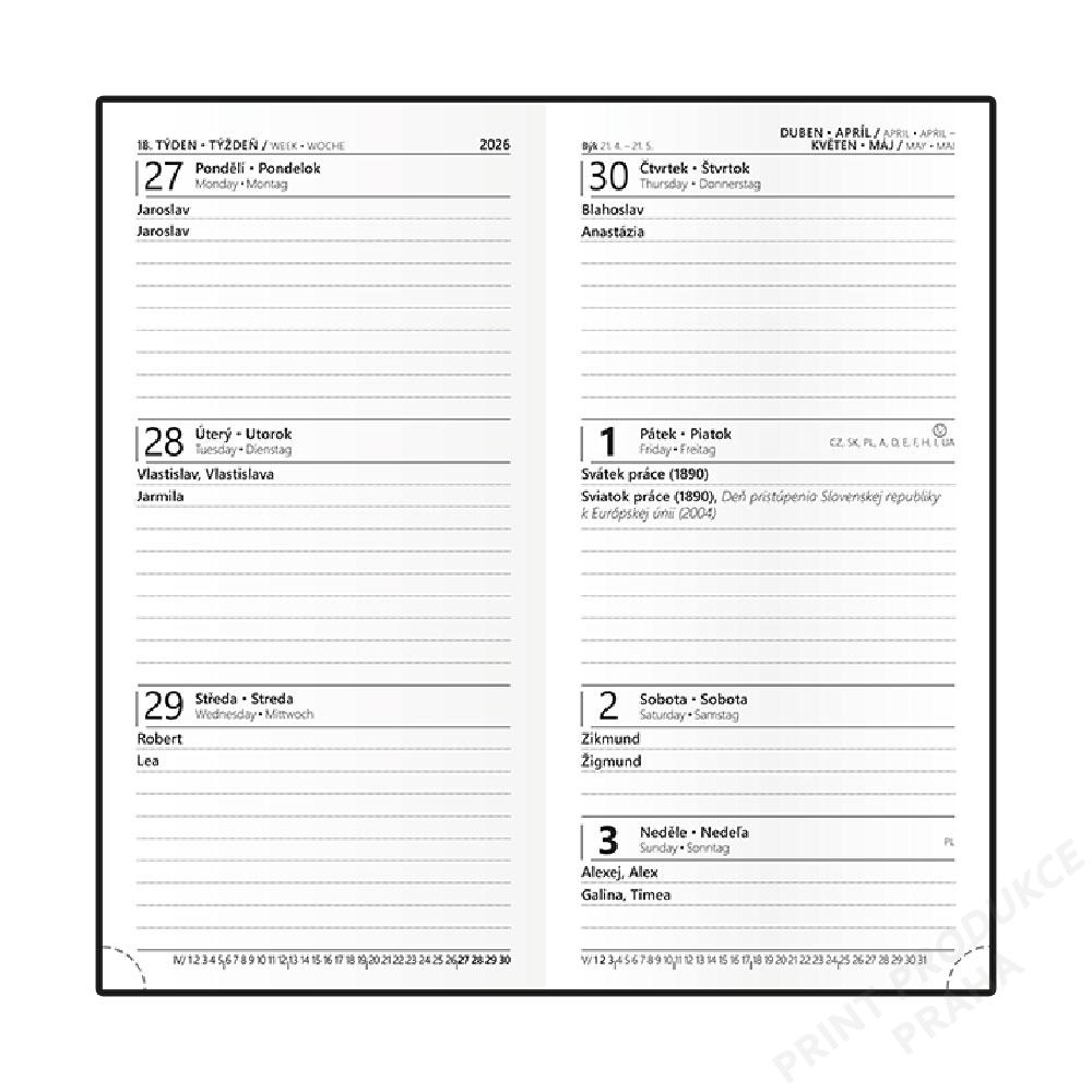 Rozměr: 75 x 150 mm - Formát: kapesní - Kalendárium: týdenní české a slovenské jmenné - Jazykové mutace: CZ, SK, EN, DE - Potahový materiál: pololesklý, jemně strukturovaný materiál - Papír: bílý s perforovanými rožky - Počet stran: 128 - Vazba: šitá V8 - Záložka: bílá stužka - - Kalendárium obsahuje: - měsíční fáze, roční období, letní a zimní čas, - znamení zvěrokruhu, řádkový přehled 2 měsíců - - Informační stránky obsahují: - osobní údaje, přehledný kalendář 2026 a 2027, - měsíční plánování 2026, plán dovolených 2026, - CZ/SK křestní jména, mezinárodní svátky 2026, - roční plánovací kalendář CZ, místo na poznámky. - - Ražba roku přes stříbrnou pásku. - Vhodný pro ražbu přes folii a potisk.