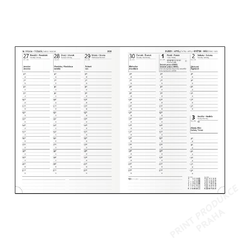 Rozměr: 200 x 280 mm - Formát: A4 - Kalendárium: týdenní české a slovenské jmenné - Jazykové mutace: CZ, SK, EN, DE - Potahový materiál: jemný hladký materiál - Papír: bílý s perforovanými rožky - Počet stran: 144 - Vazba: šitá vazba V8 - Záložka: bílá stužka - - Kalendárium obsahuje: - časové rozmezí: 6:00 - 21:30 (po 30 min.), - měsíční fáze, roční období, letní a zimní čas, - znamení zvěrokruhu, odpočet dnů, měsíční tabulkový přehled - - Informační stránky obsahují: - přehledný kalendář 2026 a 2027, měsíční plánování 2026,