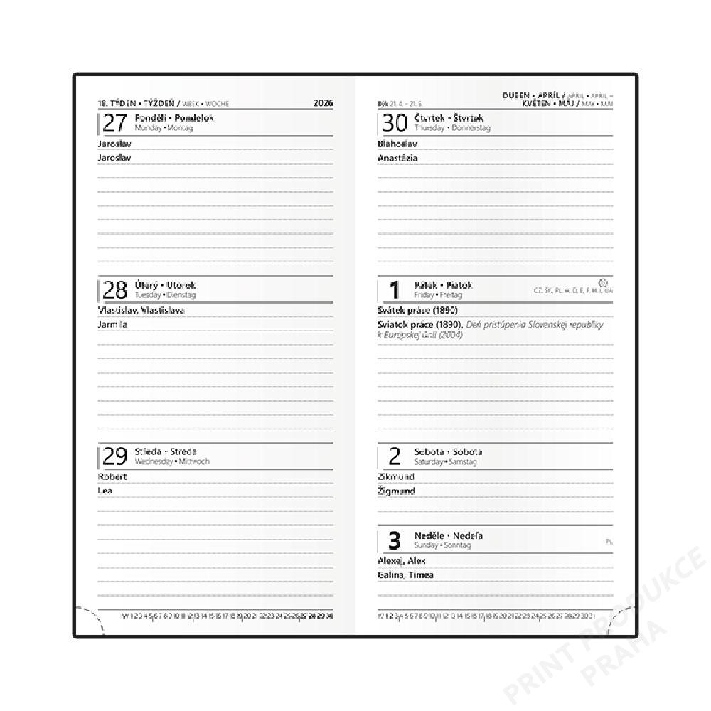 Rozměr: 75 x 150 mm - Formát: kapesní - Kalendárium: týdenní české a slovenské jmenné - Jazykové mutace: CZ, SK, EN, DE