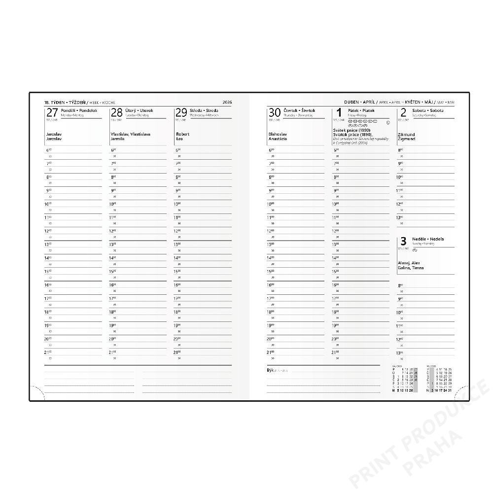 Rozměr: 200 x 280 mm - Formát: A4 - Kalendárium: týdenní české a slovenské jmenné - Jazykové mutace: CZ, SK, EN, DE - Potahový materiál: pololesklý, jemně strukturovaný materiál - Papír: bílý s perforovanými rožky - Počet stran: 144 - Vazba: šitá vazba V8 - Záložka: bílá stužka - - Kalendárium obsahuje: - časové rozmezí: 6:00 - 21:30 (po 30 min.), - měsíční fáze, roční období, letní a zimní čas, - znamení zvěrokruhu, odpočet dnů, měsíční tabulkový přehled - - Informační stránky obsahují: - přehledný kalendář 2026 a 2027, měsíční plánování 2026,
