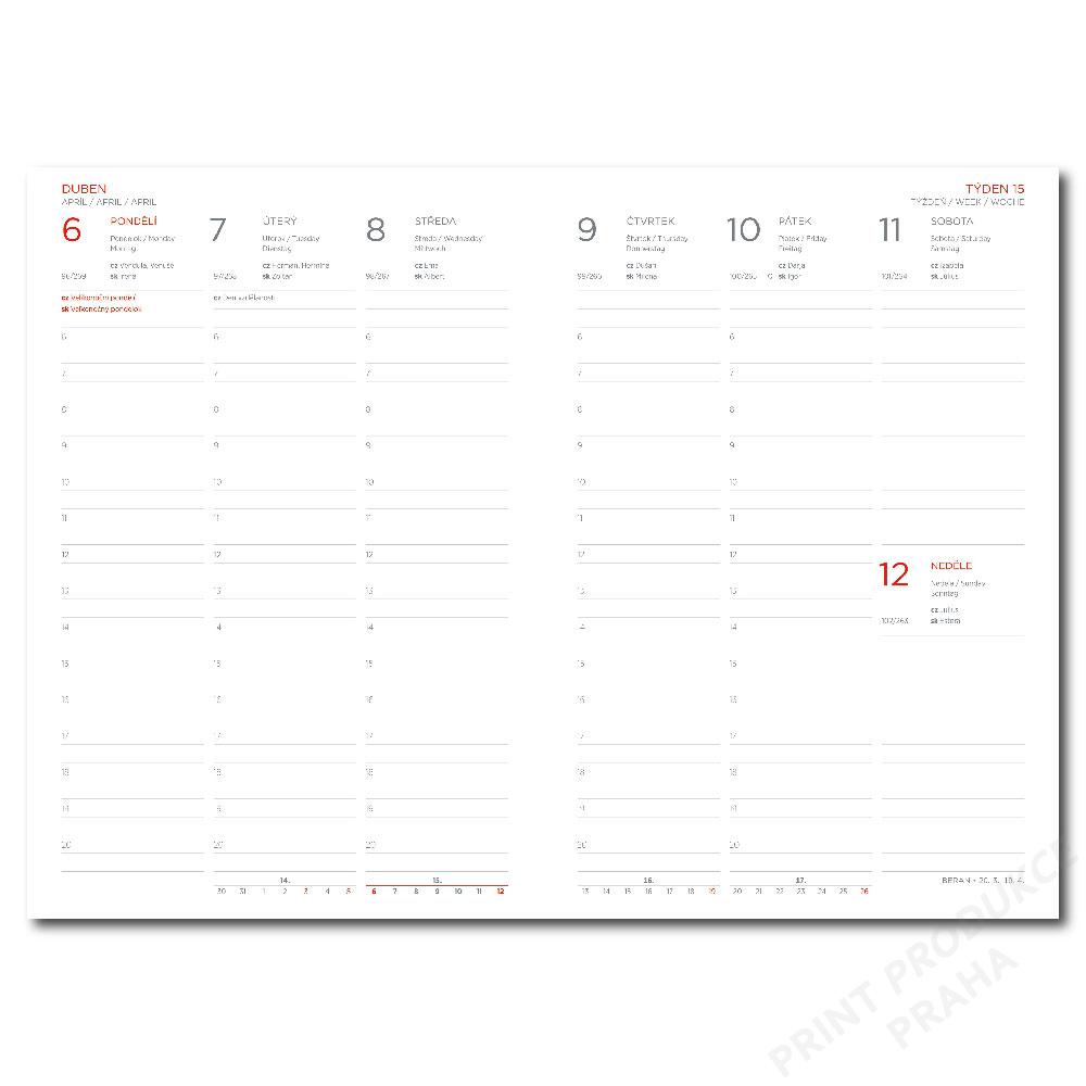 Rozměr: 165 x 240 mm - Formát: B5 - Kalendárium: české týdenní - Rozsah: 128 stran - Papír: bílý - Materiál desek: koženka - Hlavní jazyk: čeština - Další jazyky: SK, EN, DE - - Infostrany obsahují: - CZ/SK křestní jména, státní svátky CZ/SK,