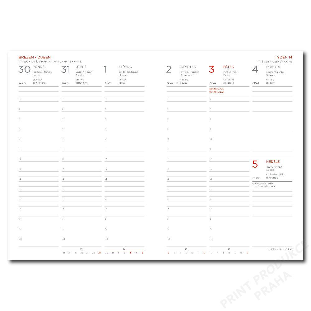 Rozměr: 148 x 210 mm - Formát: A5 - Kalendárium: české týdenní + 97 stran pro poznámky z druhé stany - Rozsah: 224 stran - Papír: bílý - Materiál desek: dvě koženky sešité klikatým stehem - Hlavní jazyk: čeština - Další jazyky: SK, EN, DE